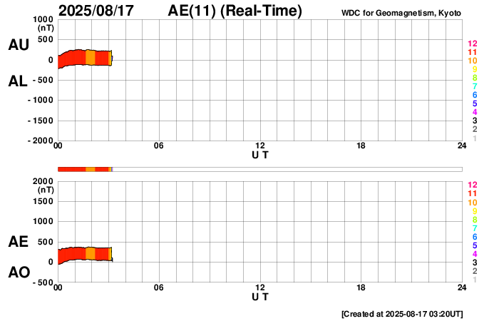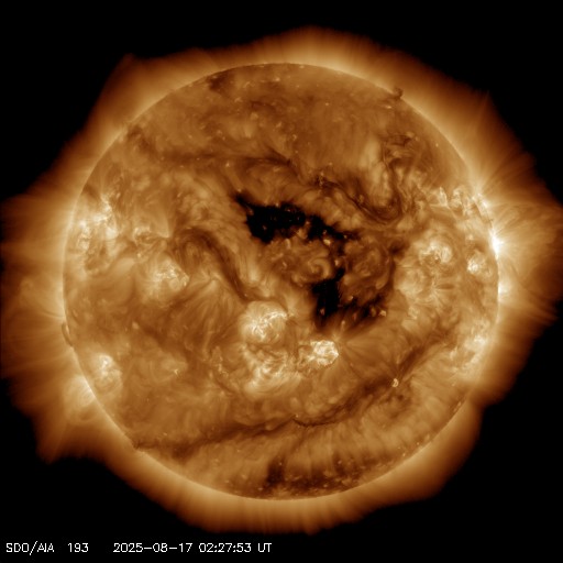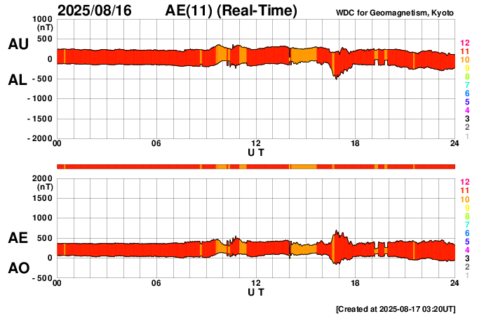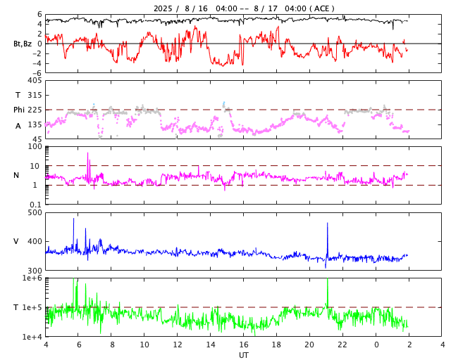2025/ 8/17 12:33 更新 太陽風はより低速になっています。磁気圏も穏やかです 担当 篠原 太陽風は、速度が370km/秒から340km/秒へ下がり、 より低速の風になっています。 磁場強度は、5nTと平均的な状態です。 速度が下がっているため、磁気圏は穏やかで、 AE指数は変化が少ない状態が続いています。 SDO衛星AIA193では、 コロナホールが西側(右側)に進んでいます。 明日か明後日くらいから、太陽風の速度が高まりそうです。 27日周期の図を見ると、 前周期の太陽風は、700km/秒まで速度が高まっています。 今回はどの様な高速風になるでしょうか。 太陽は穏やかに推移しています。 北西の端(右上)に達した4172黒点群で、 C3.2の小規模フレアが起きた程度です。 ![]() SDO衛星のAIA193カメラによる太陽コロナの様子 (c) SDO (NASA) ![]() SDO衛星による太陽の可視光写真。マウスの矢印を写真に重ねると、黒点番号付きの写真に切り替わります。 (c) SDO (NASA) ![]() ACEが観測した太陽風の磁場(黒線は全体の強度、赤線は南北成分) 磁場の向き、プラズマの密度、速度、温度 (c) データ:NOAA/SWPC、作図:宇宙天気ニュース ![]() AE指数(速報値) 下段のAEグラフの値が高くなると、オーロラ活動が活発化しています。 (c) 京都大学WDC ![]() ![]() 27日の太陽周期に合わせた図 太陽が同じ面を地球に向けていた27日前の変化から、今後を予想することができます。 (c) 作図:宇宙天気ニュース