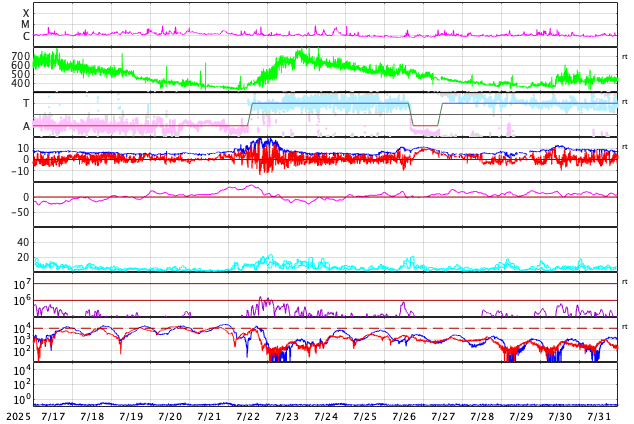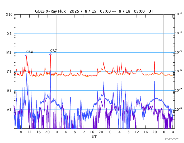 GOES衛星の太陽X線強度。赤・橙 = 0.1〜0.8 nm、青・紫 = 0.05〜0.4 nm (c) データ:NOAA/SWPC、作図:宇宙天気ニュース ![]() | |||||||||||||||||||||||||||||||||||||||||||||||||||||||||||||||||||||||||||||||||||||||||||||||||||||||||||||||||||||||||||||||||||||||||||||||||||||||||||||||||||||||||||||||||||||||||||||||||||||||||||||||||||||||||||||||||||
