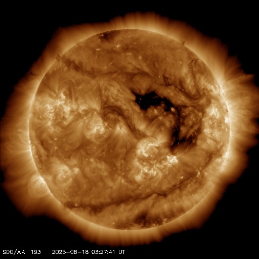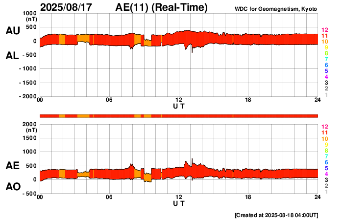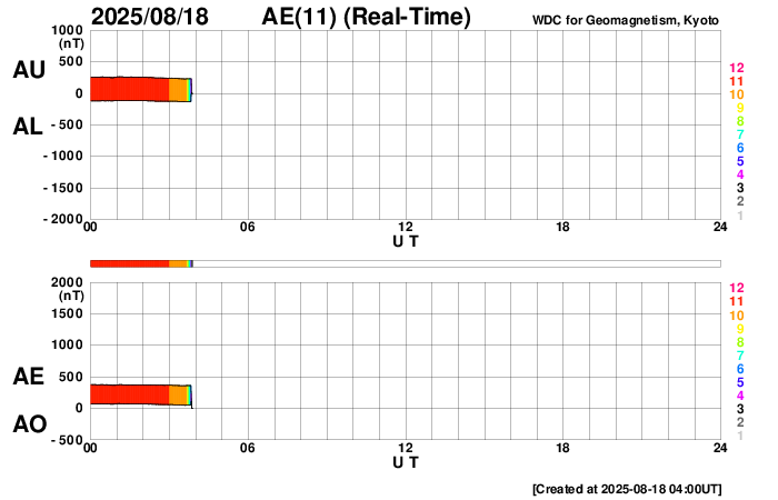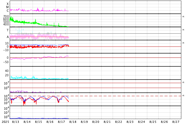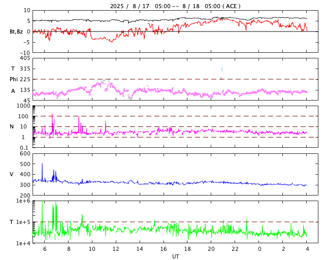 2025/ 8/18 13:13 更新 太陽風はかなり低速になっています。コロナホールの影響が近付いています。 担当 篠原 太陽風の速度は340km/秒から300km/秒へ更に低下して、 かなり低速になっています。 磁場強度は、5nTから6nTに少し上がっていますが、 平均的な状態です。 磁場の南北成分は、 グラフの中ほどから北向きになっています。 速度が下がっているため磁気圏は穏やかで、 AE指数は小さい変化が見られる程度です。 SDO衛星AIA193では、 コロナホールが西側(右側)にだいぶ進んでいます。 この後、この領域の影響が始まりそうです。 太陽風磁場の強まりや速度の高まりなど、 どの様な変化がやって来るか注目して下さい。 太陽は、中心部南西側(右下)の4180黒点群で C3.3の小規模フレアが発生した程度で、 穏やかな状態が続いています。 黒点もだいぶ少なくなっています。 ![]() SDO衛星のAIA193カメラによる太陽コロナの様子 (c) SDO (NASA) ![]() SDO衛星による太陽の可視光写真。マウスの矢印を写真に重ねると、黒点番号付きの写真に切り替わります。 (c) SDO (NASA) ![]() ACEが観測した太陽風の磁場(黒線は全体の強度、赤線は南北成分) 磁場の向き、プラズマの密度、速度、温度 (c) データ:NOAA/SWPC、作図:宇宙天気ニュース ![]() AE指数(速報値) 下段のAEグラフの値が高くなると、オーロラ活動が活発化しています。 (c) 京都大学WDC ![]() ![]() 27日の太陽周期に合わせた図 太陽が同じ面を地球に向けていた27日前の変化から、今後を予想することができます。 (c) 作図:宇宙天気ニュース