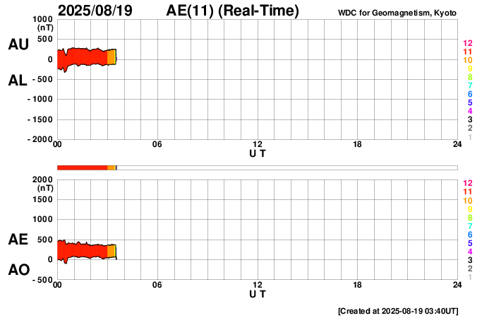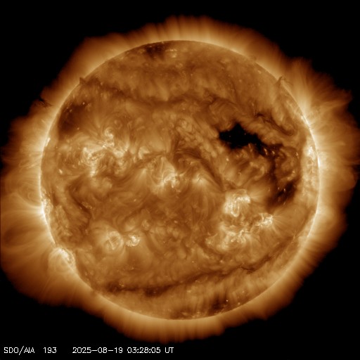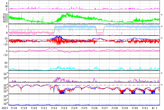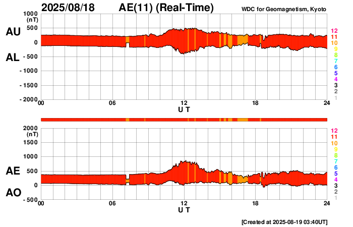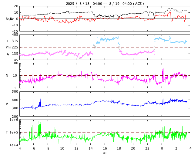 2025/ 8/19 12:45 更新 太陽風の速度は、やや低速程度に少し上がっています。 担当 篠原 太陽風は、昨日の午後から少し不安定になり、 磁場強度が、5nTから10nTへ強まりましたが、 その後、4nTに一旦下がって、 そこから再び強まって、現在は14nTに強まっています。 速度は、300km/秒からゆっくり高まって、 現在は380km/秒とやや低速くらいに上がっています。 SDO衛星AIA193の北西側(右上)に進んでいる コロナホールの影響が始まっているのでしょうか。 この後、更に速度が高まるか注目して下さい。 27日周期の図を見ると、 前周期の太陽風も今くらいから速度の高まりが始まっています。 磁気圏の活動は、現在は比較的穏やかです。 太陽風の磁場が強まっているので、 南向きに大きく変化して、速度も高まって来ると、 磁気圏の活動も活発になります。 今後の推移に注目して下さい。 太陽は、穏やかに推移しています。 X線グラフの最後のC2.1の小規模フレアは、 南東の端(左下)に現れた4188黒点群で発生しています。