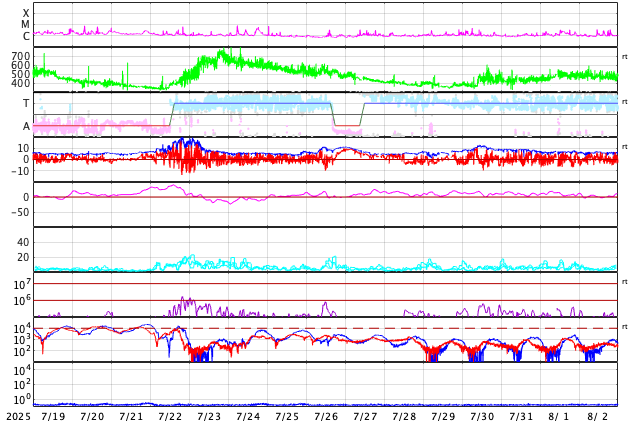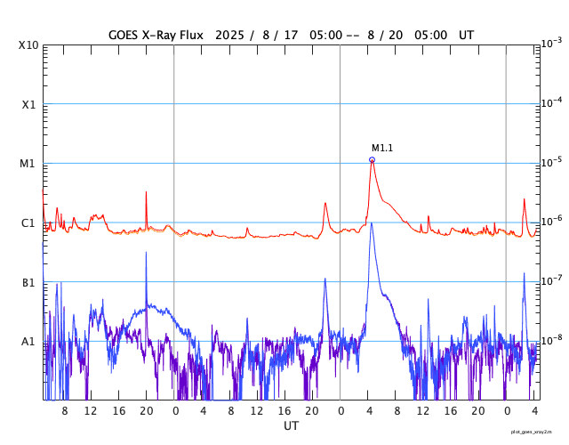 GOES衛星の太陽X線強度。赤・橙 = 0.1〜0.8 nm、青・紫 = 0.05〜0.4 nm (c) データ:NOAA/SWPC、作図:宇宙天気ニュース ![]() | |||||||||||||||||||||||||||||||||||||||||||||||||||||||||||||||||||||||||||||||||||||||||||||||||||||||||||||||||||||||||||||||||||||||||||||||||||||||||||||||||||||||||||||||||||||||||||||||||||||||||||||||||||||||||||