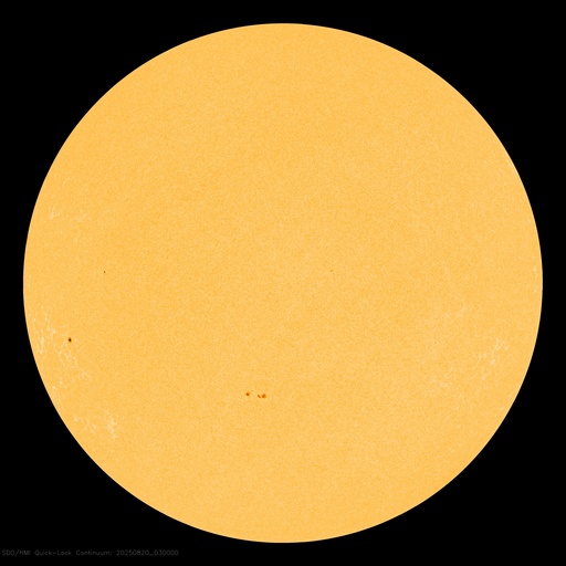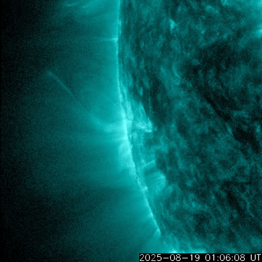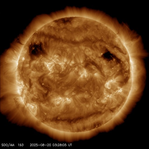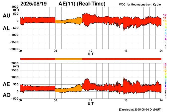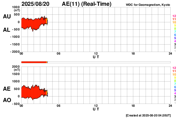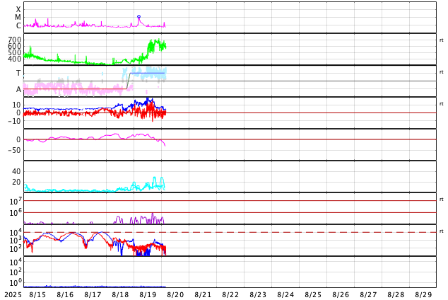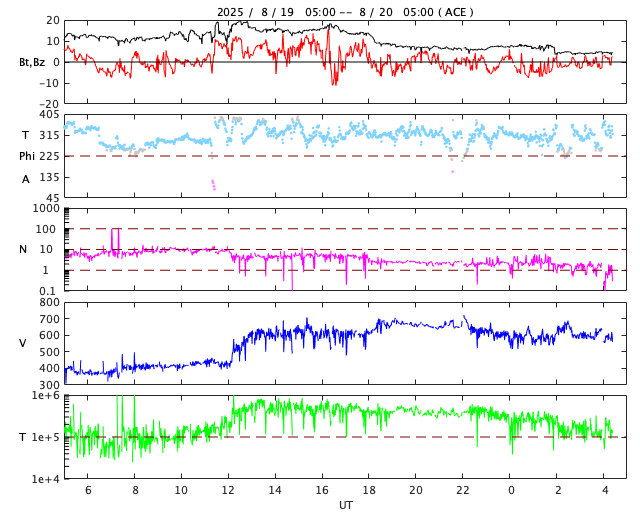 2025/ 8/20 13:34 更新 高速太陽風が到来し、太陽風の速度は600km/秒台に高まっています。 担当 篠原 注目していた高速の太陽風が始まりました。 太陽風の速度は、昨夜、19日21時(世界時19日12時)頃に、 420km/秒から600km/秒へ高まり、 その後、600〜650km/秒の間で推移しています。 SDO衛星AIA193の太陽の北西側(右上)に進んだ コロナホールの影響がやって来た様です。 太陽風の磁場強度は、12nTから20nT近くまで強まり、 その後低下して、現在は4nTと平均的な値に戻っています。 南北成分は、南北に切り替わりながら変化していますが、 強い南向きの変化は発生していません。 このため、磁気圏の活動はある程度の強まりになっていて、 AE指数は、500nT程度の中規模の変化が続いています。 27日周期の図を見ると、 前周期の高速風は4日半ほど続いています。 SDO衛星AIA193で見えていたコロナホールの広がりは、 前周期と同じくらいでした。 高速風の継続時間も同じくらいになるかもしれません。 太陽では、昨日の昼、19日13時(世界時19日4時)に、 南東の端(左下)の4188黒点群で、 M1.1の中規模フレアが発生しました。 Mクラスのフレアの発生は、 8月12日のM1.8以来で、1週間ぶりです。 X線グラフでは、最後にC2.5の小規模フレアが起きていますが、 これは、中心部北東側(左上)の黒点の見えない場所で発生しています。