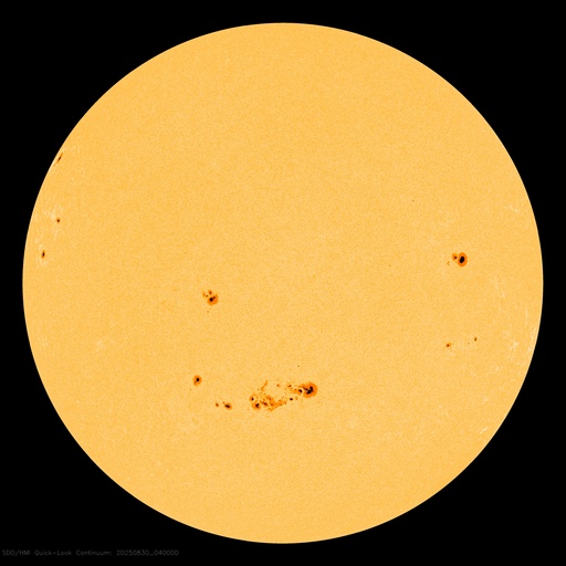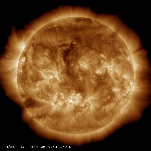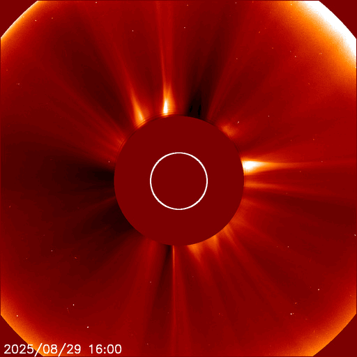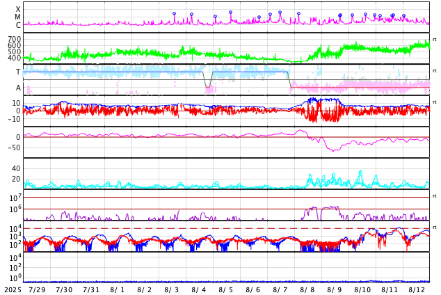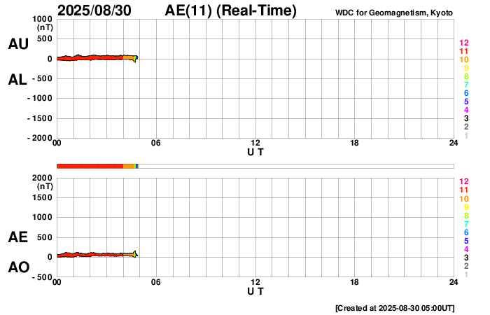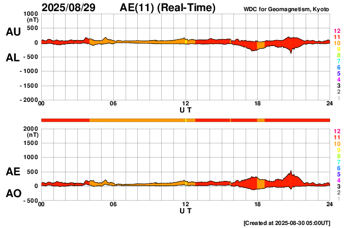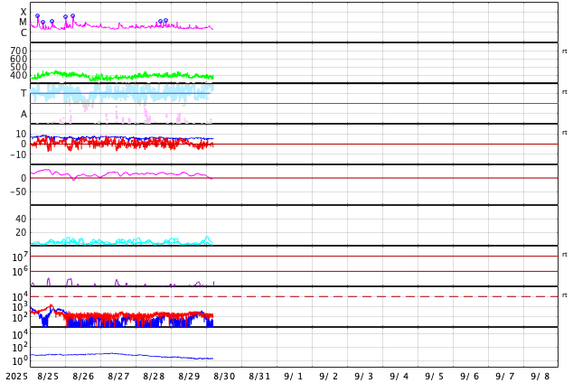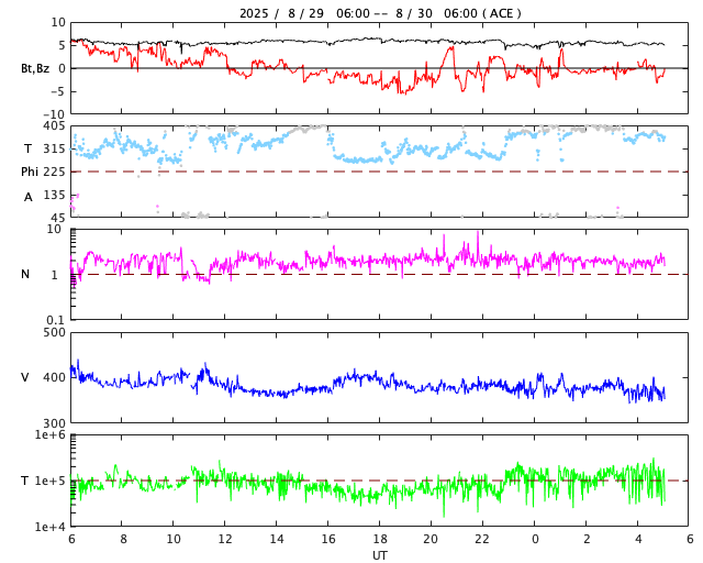 2025/ 8/30 14:11 更新 太陽風はやや低速になっています。フレアの発生は少なくなっています。 担当 篠原 太陽風は、380km/秒前後とやや低速の状態で推移しています。 磁場強度は、6nTと平均的な値です。 磁場の南北成分は、 北寄りから南寄り、そして0nT付近と変化しています。 南寄りの頃に磁気圏の活動が少し強まって、 AE指数で400nT程度の小規模の変化が発生しています。 その他の時間帯は変化がなく、穏やかです。 SDO衛星AIA193では、 太陽の中心付近にコロナホールはなく、 太陽風は穏やかな状態が続きそうです。 一方、南東の端(左下)にコロナホールの薄暗い領域が少し見えています。 27日周期の図を見ると、 前周期はこの部分にコロナホールが広がっていて、 8月9日頃から太陽風の速度が高まっています。 今回は9月5日頃でしょうか。 現在はどの様なコロナホールが広がっているのか注目して下さい。 太陽は、フレアの発生が少なくなっています。 中心部南側(下側)の4197黒点群では、 C5.9、C5.0などの小規模フレアが発生していますが、 このまま穏やかになるのか、再び活動が強まるのか、 引き続き注目してください。 SOHO衛星LASCO C2、C3では、 今日未明、30日2時(世界時29日17時)頃に、 太陽の右下へ広がるCME(コロナ質量放出)が観測されています。 太陽の向こう側で発生した現象です。