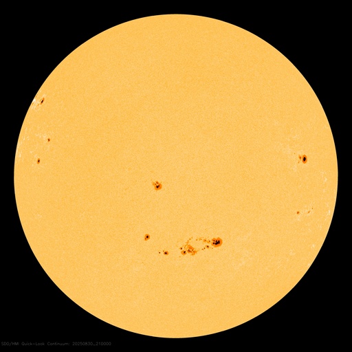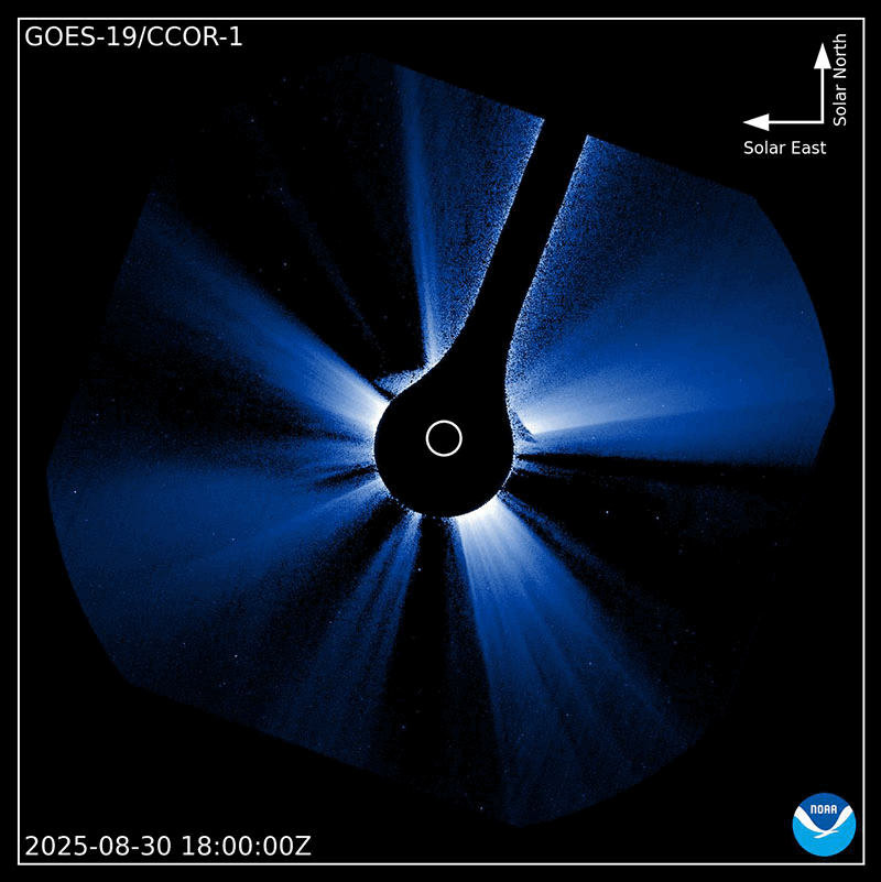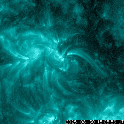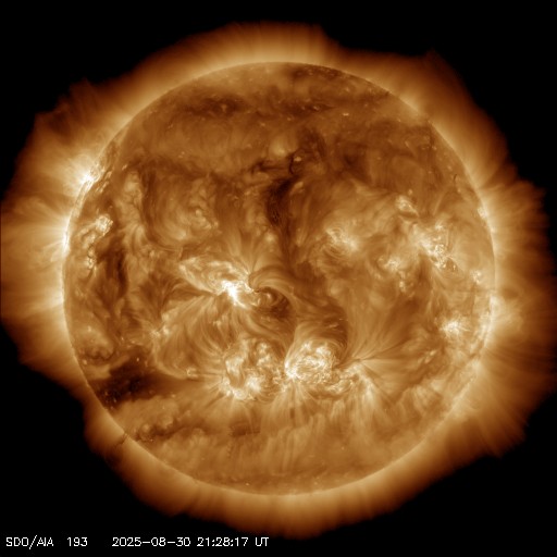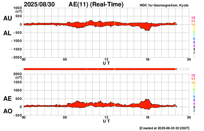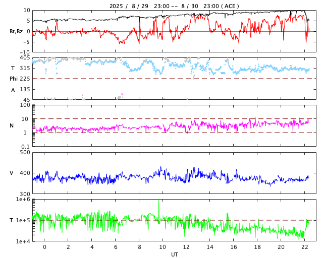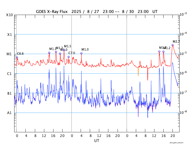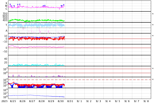 2025/ 8/31 07:32 更新 M2.7の中規模フレアが発生しました。ハロー型のCMEが発生しています。 担当 篠原 今朝、31日4時(世界時30日19時)に、 太陽の中心付近の4199黒点群で、 M2.7の中規模フレアが発生しました。 SDO衛星AIA131の動画を掲載します。 X線グラフを見ると、 強度の高まりがゆっくり下がるタイプのフレアです。 この場合、CME(コロナ質量放出)が発生することが多く、 GOES衛星のCCORR-1を見ると、 太陽を丸く囲むようにハロー型のCMEが広がっています。 この太陽風の乱れは地球へ向かっていると考えられます。 到来は、9月2〜3日頃でしょうか。 太陽風の乱れによって、磁気圏の活動が激しくなる可能性があります。 今後の情報に注目して下さい。 太陽では、中心部南側の4197群でも M1.3、M1.2の中規模フレアが発生しています。 2つの領域について、今後のフレアの発生に注目して下さい。 太陽風は、370km/秒前後とやや低速の状態が続いています。 磁場強度は、5nTからゆっくりと強まって、 10nTに達しています。 磁場の南北成分は、全体としては北寄りになっていますが、 南向きに -5nT程度の変化も発生しています。 磁気圏では小規模の活動が発生していて、 AE指数は、200〜300nT程度の変化が起きています。 SDO衛星AIA193では、 南東の端(左下)のコロナホールが良く見えるようになってきました。 前周期と同じ様な場所に見えています。