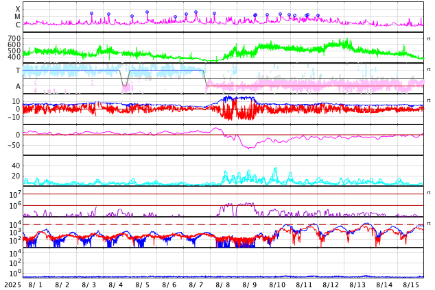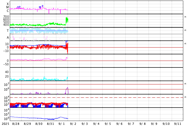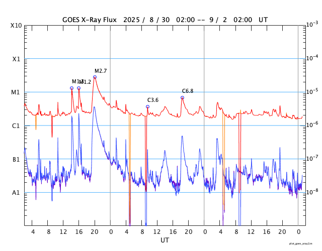 GOES衛星の太陽X線強度。赤・橙 = 0.1〜0.8 nm、青・紫 = 0.05〜0.4 nm (c) データ:NOAA/SWPC、作図:宇宙天気ニュース ![]() | ||||||||||||||||||||||||||||||||||||||||||||||||||||||||||||||||||||||||||||||||||||||||||||||||||||||||||||||||||||||||||||||||||||||||||||||||||||||||||||||||||||||||||||||||||||||||||||||||||||||||||||||||||||||||||||||||||||||||||||||||||||||||||||||||||||||||