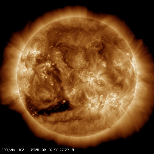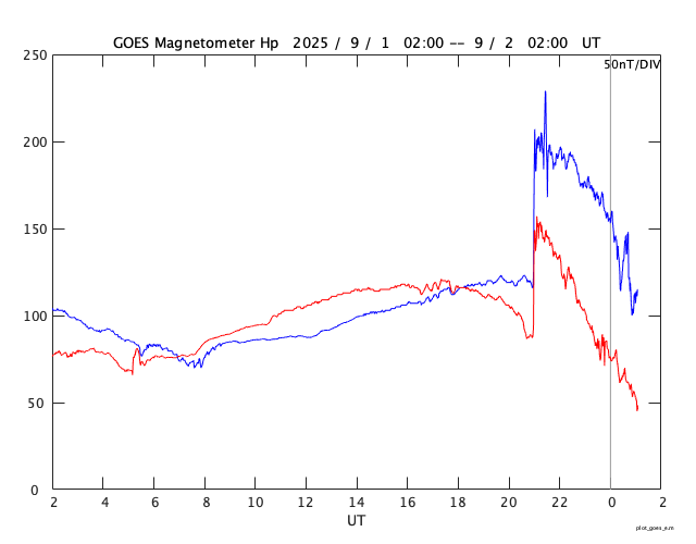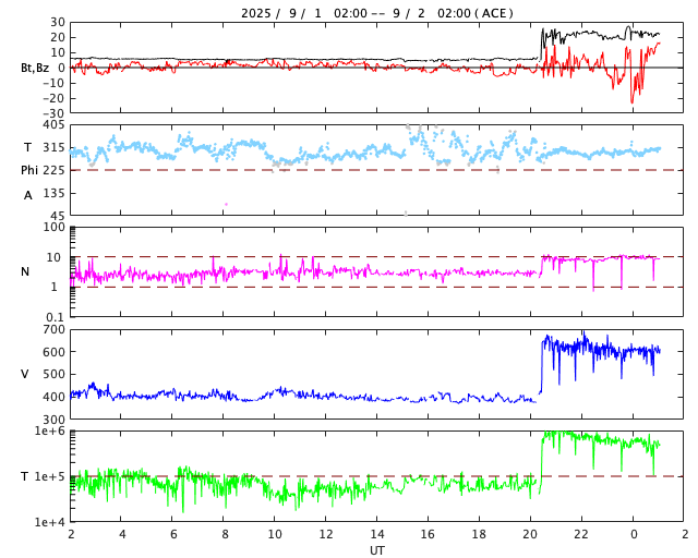 2025/ 9/ 2 10:19 更新 CMEによる太陽風の乱れが到来しました。磁気圏の活動はあまり強まっていません。 担当 篠原 今朝早く、2日5時半(世界時1日20時半)に、 31日のCME(コロナ質量放出)による太陽風の乱れが ACE衛星で観測されました。 太陽風の速度は、390km/秒から650km/秒へ急に高まり、 現在は少し下がって600km/秒ですが、 高速の状態は続いています。 磁場強度は、5nTから20〜25nTへ強まっています。 太陽風の強まりは、およそ30分後の 2日6時(世界時1日21時)に地球へ達しています。 気象庁地磁気観測所の磁場データでは、 磁場の急な強まりが観測されています(1枚目の図)。 太陽風が急に強まって、磁気圏を圧縮したことによる変化です。 この変化は、静止軌道のGOES衛星でも観測されていて、 磁場の南北成分が急にプラス側に高まっています。 青線のGOES-18は、真昼に近い位置にいたため、 強まりがより大きくなっています。 赤線のGOES-19は、夕方側にいました。 注目していた太陽風磁場の南北成分は、 0nT付近で南北に振れていて、 南向きの強まりは一時的で、最後は北向きに強まっています。 このため、磁気圏の活動は大きくは強まっておらず、 AE指数は、乱れの到来直後に1300nTの大きい変化が発生しましたが、 その後、変化が小さくなり、 グラフの最後で再び大きい変化が発生していますが、 太陽風磁場の様子から、一時的な強まりになりそうです。 この後、太陽風磁場の南北成分は、 どの様に推移するでしょうか。 南向きに強まると、磁気圏の活動は激しくなる可能性があります。 太陽風の速度や磁場強度が高まっている間は注目して下さい。 SDO衛星AIA193では、 コロナホールの先頭(右端)が太陽の中心線に達しています。 3日後くらいから、 この領域の影響で太陽風が強まる可能性があります。 今回の乱れが通り過ぎた後は、こちらに注目して下さい。 太陽は、南西(右下)の4197黒点群で、 C4.8、C3.9の小規模フレアが発生しています。 全体としては、比較的穏やかな状態です。 ![]() 地上の磁場データで、2日6時(世界時1日21時)に急な強まりが観測されました。 (c) 気象庁地磁気観測所 ![]() GOES衛星による、静止軌道での磁場の南北成分の変化。 (c) GOES衛星 (NOAA)、作図 : 宇宙天気ニュース ![]() SDO衛星のAIA193カメラによる太陽コロナの様子 (c) SDO (NASA) ![]() SDO衛星による太陽の可視光写真。マウスの矢印を写真に重ねると、黒点番号付きの写真に切り替わります。 (c) SDO (NASA) ![]() ACEが観測した太陽風の磁場(黒線は全体の強度、赤線は南北成分) 磁場の向き、プラズマの密度、速度、温度 (c) データ:NOAA/SWPC、作図:宇宙天気ニュース ![]() AE指数(速報値) 下段のAEグラフの値が高くなると、オーロラ活動が活発化しています。 (c) 京都大学WDC ![]() ![]() 27日の太陽周期に合わせた図 太陽が同じ面を地球に向けていた27日前の変化から、今後を予想することができます。 (c) 作図:宇宙天気ニュース