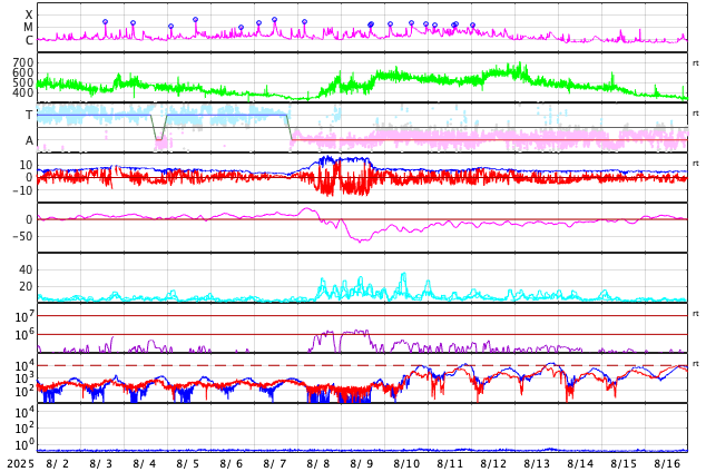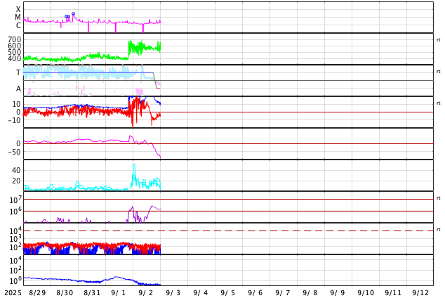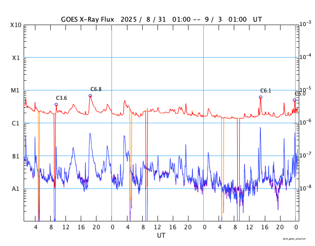 GOES衛星の太陽X線強度。赤・橙 = 0.1〜0.8 nm、青・紫 = 0.05〜0.4 nm (c) データ:NOAA/SWPC、作図:宇宙天気ニュース ![]() | ||||||||||||||||||||||||||||||||||||||||||||||||||||||||||||||||||||||||||||||||||||||||||||||||||||||||||||||||||||||||||||||||||||||||||||||||||||||||||||||||||||||||||||||||||||||||||||||||||||||||||||||||||||||||||||||||||||||||||||||||||||||||||||||||||||||||||||||||