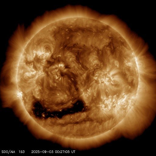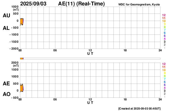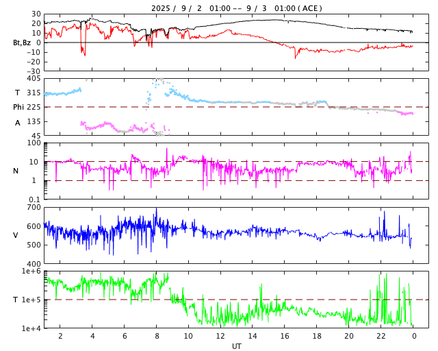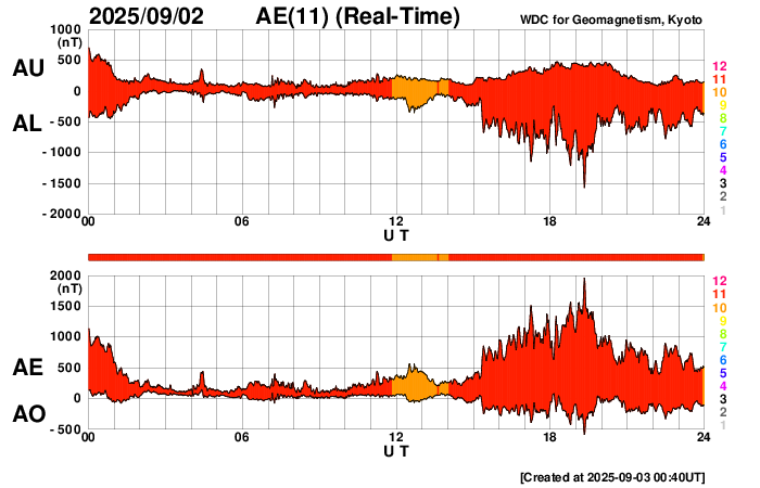 2025/ 9/ 3 09:48 更新 太陽風の乱れは続いています。磁場が南向きになり、磁気圏の活動が強まりました。 担当 篠原 太陽風の強まりは続いています。 速度は、昨夜までは600km/秒付近で推移していましたが、 その後は次第に低下して、現在は550km/秒です。 高速の状態は続いています。 一方、磁場強度は、20nTから15nTへ下がりますが、 再び深夜にかけて24nTへ強まり、 その後下がって、現在は12nTです。 注目していた太陽風磁場の南北成分は、 3日0時(世界時2日15時)頃に 北向きから南向きに切り替わり、 -10nTくらいまで強まって、 現在は-4nTと変化は小さくなっています。 磁場が南向きに切り替わる頃から磁気圏の活動も活発になり、 AE指数は、1500〜2000nTに達する激しい変化が発生しています。 ただ、強まりの時間は短く、 グラフの最後は500nTを超えるくらいの中規模の変化に下がっています。 この後は、太陽風の乱れは次第に弱まり、 一旦穏やかな状態に戻りそうです。 その後、SDO衛星AIA193の太陽コロナ写真の 南東側(左下)に見えているコロナホールの影響がやって来そうです。 27日周期の図の前周期の変化を参考にすると、 9月5〜6日頃でしょうか。 太陽は、北西(右上)の4199黒点群でC6.1、 南西(右下)の4197群でC4.2、C4.9 などの小規模フレアが発生しています。 全体としては比較的穏やかな状態です。