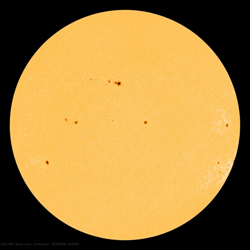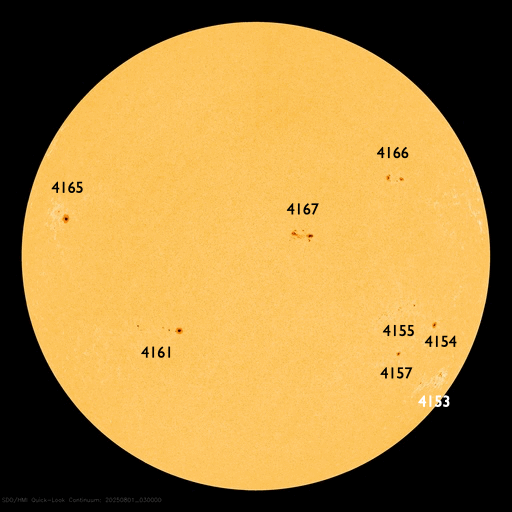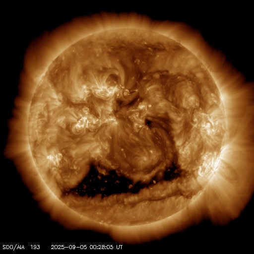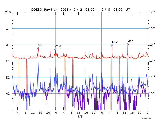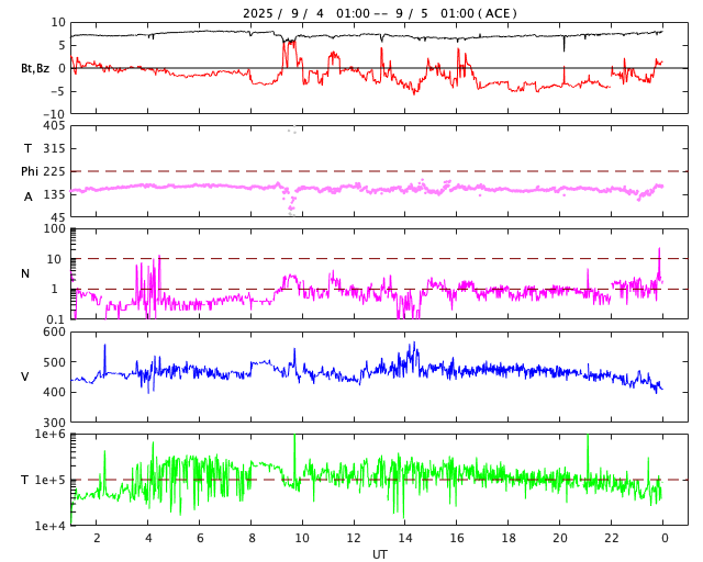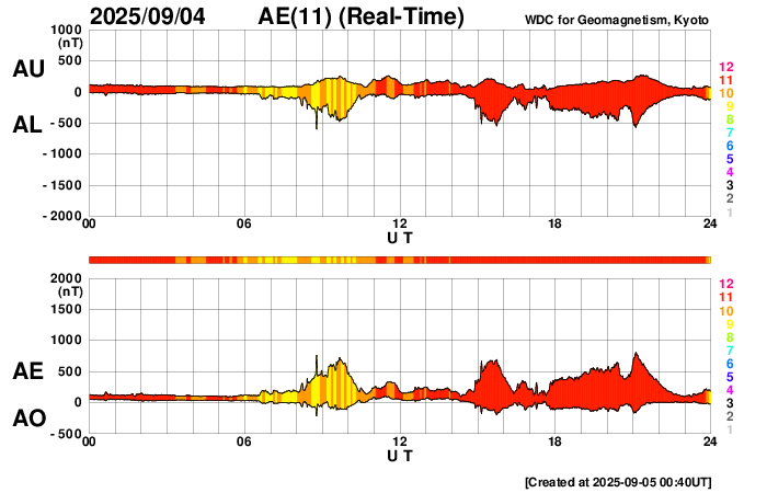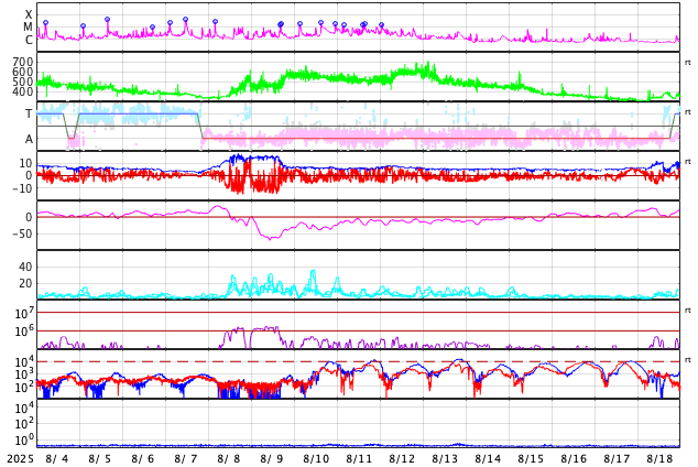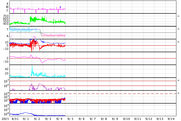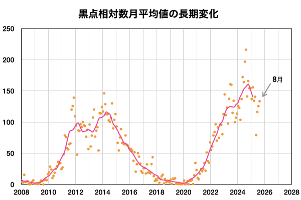 2025/ 9/ 5 09:54 更新 太陽風は平均的な速度です。コロナホールの影響が近付いています。8月の黒点相対数は 133.5 でした。 担当 篠原 WDC-SILSO より、8月の黒点相対数月平均値は、 133.5 と発表されました。 5月に79.2と大きく下がった後は、 6月は116.3、7月は125.6、8月は133.5と、 比較的安定した値が続いています。 それでも、2024年の150を超えていた頃と比較すると、 一段下がっていることは確かです。 1日値を見ると、 8月26〜31日にかけて180を超えるくらいに高まっていました。 動画でも終わり頃に黒点が多くなる様子が分かります。 特に28日は204まで高まっていて、 200に達したのは4月24日の201以来で、4か月ぶりです。 一方、8月19日は黒点が少なくなっていて、 黒点相対数は34まで下がりました。 ここまで下がったのは、2024年4月1日の31以来で、 こちらは1年4か月ぶりです。 現在の太陽は、中心部北側(上側)の4207黒点群の活動が強まり、 4日14時半(世界時4日5時半)にC9.2の小規模フレア、 4日22時半(世界時4日13時半)にM1.0の中規模フレア などのフレアが発生しています。 この後の活動に注目して下さい。 また、中心部の4206黒点群で 5日4時(世界時4日19時)にC3.3の小規模フレアが発生しましたが、 SDO衛星AIA304を見ると、 この時にフィラメント噴出が発生しています。 太陽の中心部のため、 噴出は地球の方向へ向かっている可能性がありますが、 SOHO衛星LASCO C2やSTEREO Ahead衛星COR2では、 CME(コロナ質量放出)は特に見えていません。 噴出としては弱かったのでしょうか。 太陽風は、速度が450km/秒から470km/秒へ少し上がりましたが、 グラフの最後で400km/秒に下がっています。 平均的な状態です。 磁場強度は、7〜8nTと少し強くなっています。 太陽風磁場の南北成分は、 グラフの中盤から南寄りで変化する様になっています。 このため、磁気圏の活動も高まっていて、 AE指数は700nT程度の中規模の変化が繰り返し発生しています。 SDO衛星AIA193の太陽コロナ写真を見ると、 南半球のコロナホールは西側(右側)にだいぶ進んでいます。 この後、この領域の影響で太陽風の速度が高まる可能性があります。 変化に注目して下さい。