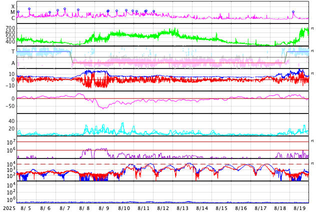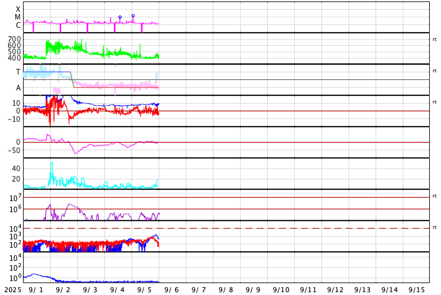 - 2025/ 9/ 2 10:19 CMEによる太陽風の乱れが到来しました。磁気圏の活動はあまり強まっていません。