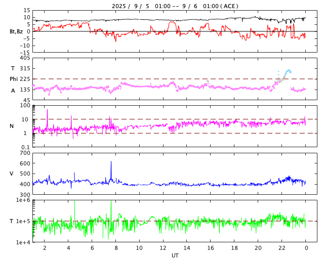 - 2025/ 9/ 4 10:18 太陽風の乱れは終わり、平均的な速度に戻っています。ニュージーランドのオーロラをどうぞ。