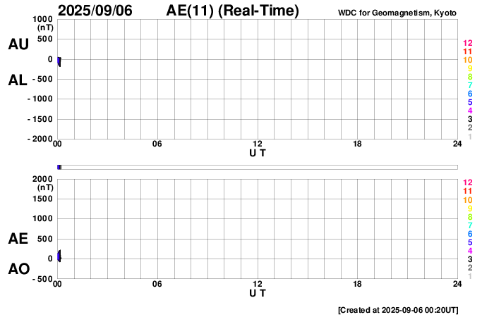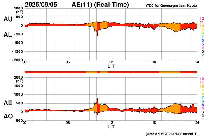 下段のAEグラフの値が高くなると、オーロラ活動が活発化しています。