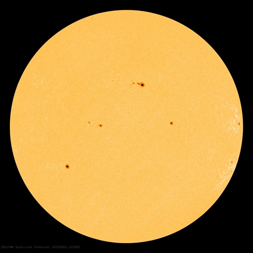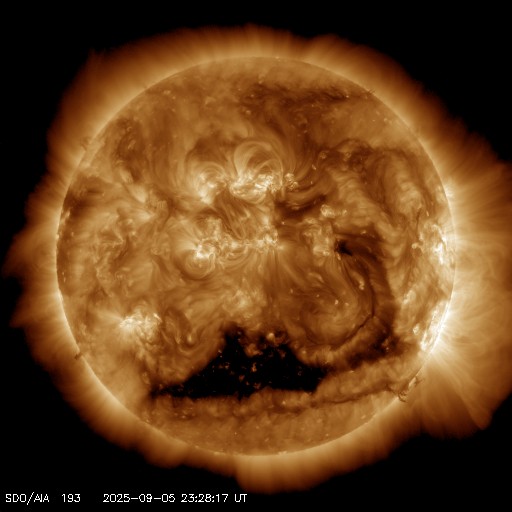 - 2025/ 9/ 5 09:54 太陽風は平均的な速度です。コロナホールの影響が近付いています。8月の黒点相対数は 133.5 でした。