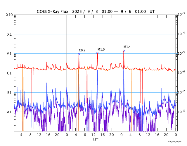 GOES衛星の太陽X線強度。赤・橙 = 0.1〜0.8 nm、青・紫 = 0.05〜0.4 nm