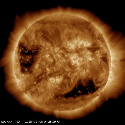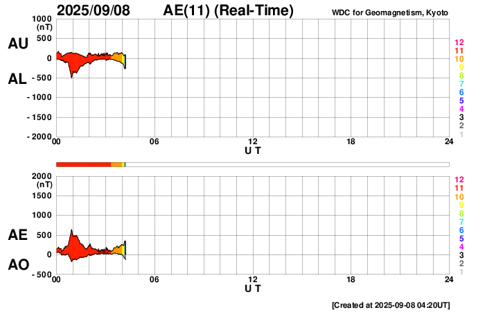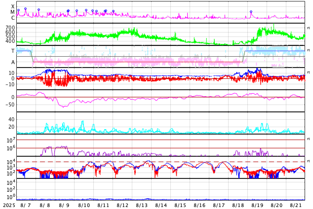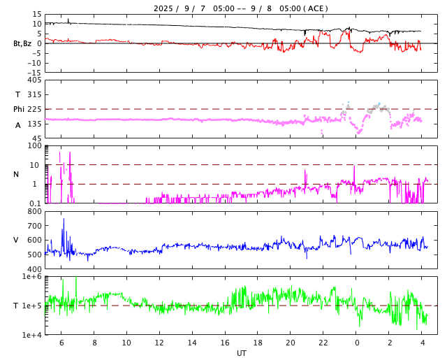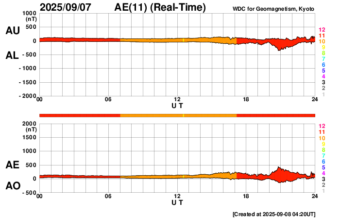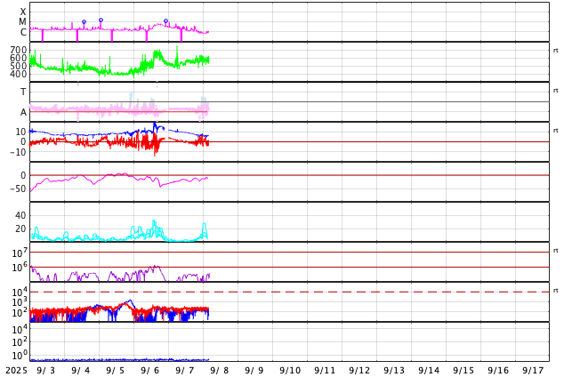 2025/ 9/ 8 13:37 更新 太陽風の速度は560km/秒に高まっています。磁気圏はやや活動的です。 担当 篠原 太陽風の速度は、500km/秒からゆっくりと高まり、 560km/秒とより高速になっています。 太陽の南半球のコロナホールの影響が強まった様です。 太陽風の磁場強度は、10nTから6nTへ下がり、 こちらは平均的な状態です。 太陽風磁場の南北成分は、 グラフの前半は0nT付近で小さく変化していますが、 後半で南北に少し大きく変化する様になっています。 磁気圏の活動もこの影響で少し活発になっていて、 AE指数を見ると、初めは変化がなく穏やかですが、 後半は300〜500nTの小規模の変化が起きています。 この後も磁場の南北の変化は続くでしょうか。 SDO衛星AIA193を見ると、 南半球のコロナホールは南西側(右下)に進み、 一番影響が強まっている様です。 一方、北東の端(左上)には新しいコロナホールが見えています。 6〜7日後くらいから、 この領域の影響がやって来る可能性があります。 太陽は、北西(右上)の4207黒点群で、 C6.3、C3.3、C3.6、C3.6などの小規模フレアが、 中心部南側の4213群で、 C4.0の小規模フレアが発生しています。 活発と言うほどではありませんが、 これらの領域でフレアが発生しています。