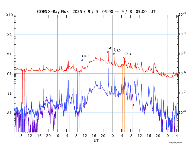 GOES衛星の太陽X線強度。赤・橙 = 0.1〜0.8 nm、青・紫 = 0.05〜0.4 nm (c) データ:NOAA/SWPC、作図:宇宙天気ニュース ![]() | |||||||||||||||||||||||||||||||||||||||||||||||||||||||||||||||||||||||||||||||||||||||||||||||||||||||||||||||||||||||||||||||||||||||||||||||||||||||||||||||||||||||||||||||||||||||||||||||||||||||||||||||||||||||||||||||||||||||||||||||||||||||||||||||||||||||||||||||