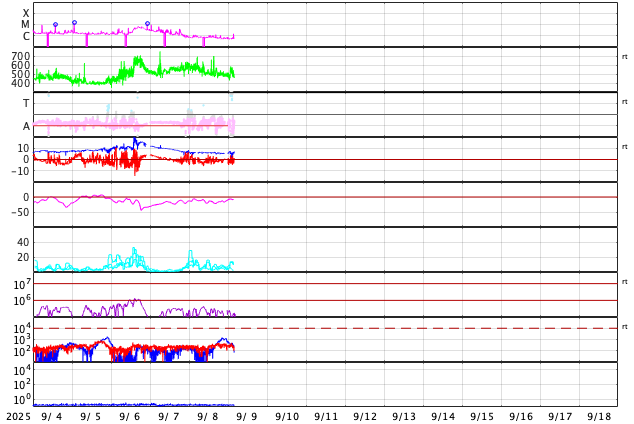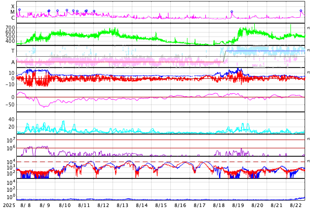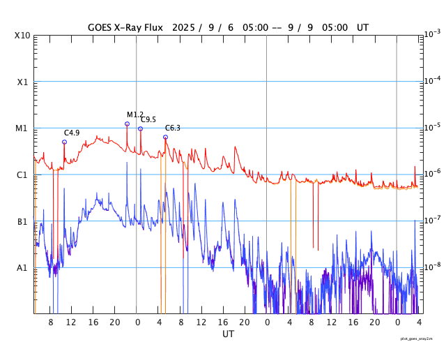GOES衛星の太陽X線強度。赤・橙 = 0.1〜0.8 nm、青・紫 = 0.05〜0.4 nm (c) データ:NOAA/SWPC、作図:宇宙天気ニュース ![]() | ||||||||||||||||||||||||||||||||||||||||||||||||||||||||||||||||||||||||||||||||||||||||||||||||||||||||||||||||||||||||||||||||||||||||||||||||||||||||||||||||||||||||||||||||||||||||||||||||||||||||||||||||||||||||||||||||||||||||||||||||||||||||||||||||