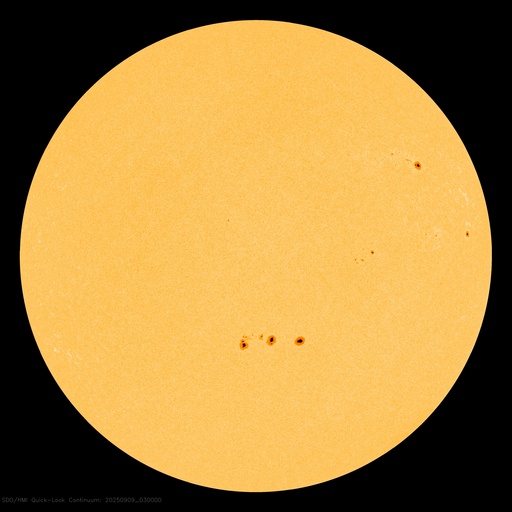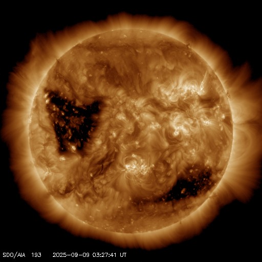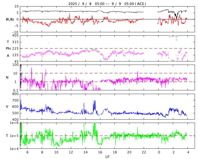2025/ 9/ 9 13:03 更新 太陽風の速度は下がり、やや高速の状態です。皆既月食の動画をどうぞ。 担当 篠原 9月8日未明の1時半に始まった皆既月食は、時々雲に隠されながらですが、 霧島市から観測することができました。 夜遅いのに暑苦しく、汗をかきながらの観測で、 とても9月とは思えませんでした。 皆既前後の写真を集めて、動画を作成しました。 皆既月食ならではの赤い色に注目して写真を選んだので、 影から出ている部分は白く飛んでいます。 太陽風の速度は、昨日のニュース以降は次第に低下して、 現在は490km/秒とやや高速の状態です。 磁場強度は、6nTと平均的な状態で推移しています。 磁場の南北成分は、弱い南寄りが続いています。 磁気圏はやや活動的で、 AE指数は、500nT前後の中規模の変化が度々発生しています。 SDO衛星AIA193では、 南半球のコロナホールは南西側(右下)にだいぶ進んでいます。 太陽風の速度が下がってきたので、影響は終わりに近付いている様です。 一方、北東(左上)には、次のコロナホールが大きく広がっています。 4〜5日後くらいから、この領域の影響で太陽風が強まりそうです。 注目して下さい。 太陽は、目立ったフレアの発生はなく穏やかです。 可視光写真では、東側(左側)に黒点はなく、 寂しい太陽になりそうです。