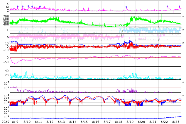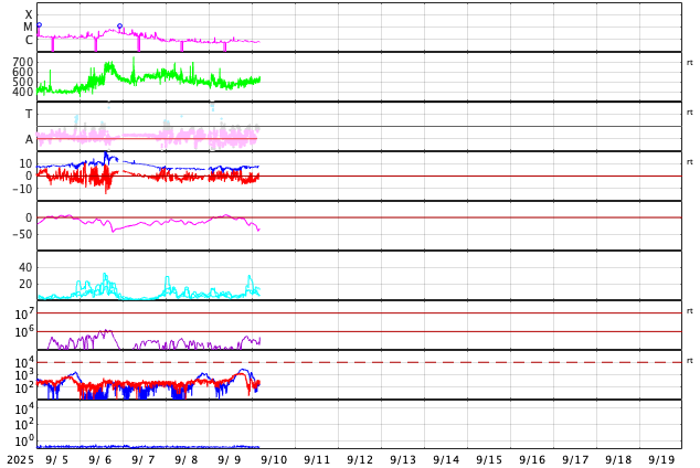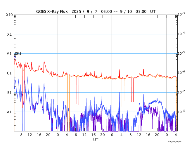 GOES衛星の太陽X線強度。赤・橙 = 0.1〜0.8 nm、青・紫 = 0.05〜0.4 nm (c) データ:NOAA/SWPC、作図:宇宙天気ニュース ![]() | ||||||||||||||||||||||||||||||||||||||||||||||||||||||||||||||||||||||||||||||||||||||||||||||||||||||||||||||||||||||||||||||||||||||||||||||||||||||||||||||||||||||||||||||||||||||||||||||||||||||||||||||||||||||||||||||||||||||