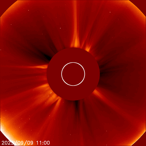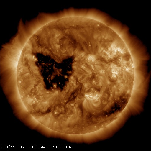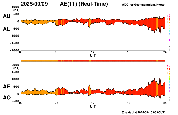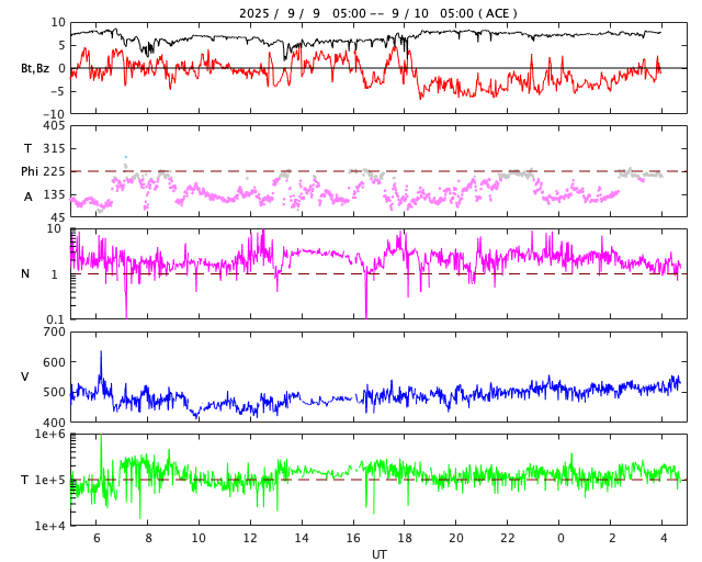 2025/ 9/10 14:00 更新 太陽風の速度は500km/秒に高まっています。イエローナイフのオーロラをどうぞ。 担当 篠原 吉田武史さんより、カナダ・イエローナイフで撮影された オーロラの写真をいただきました。 撮影は、現地4日未明と6日未明です。 1枚目は、現地4日0時30分(世界時4日6時30分)頃です。 太陽風は平均的な速度で、磁場が弱い南寄りになっていました。 現地では22時半から1時半にかけて、 比較的明瞭なオーロラがずっと出続けていたそうです。 写真の左下側におうし座が写っています。 2枚目も同じ夜で、少し前の時間の撮影の様です。 地上に見えているのは、オーロラビレッジのティーピーという建物です。 30人ほど入れるそうで、薪ストーブがあり、 暖かい飲み物も置かれているそうです。 3枚目は、現地6日0時0分(世界時6日6時0分)頃です。 太陽風の速度が500km/秒に高まって、コロナホールの影響が始まった頃です。 AE指数では、800nTと中規模の変化が発生しています。 この日は、満月少し前(8日が皆既月食です)の明るい月が出ていたそうで、 オーロラとティーピーと一緒の撮影です。 最後の4枚目は、6日1時50分(世界時6日7時50分)頃で、 ホテルへ戻るバスの集合時に突如頭上に現れたオーロラだそうです。 撮影機材は既にしまっているので、 仕方なくiPhoneで手持ちの撮影を行ったそうです。 目立つブレもなく、上空の赤いオーロラがきれいに写っています。 このオーロラの出現は、ほんの2〜3分だったそうで、 一瞬のチャンスを見事に捉えています。 秋のイエローナイフは、気温は10度前後と寒さは厳しくなかったそうで、 軽装でオーロラを見ることができたとのことです。 吉田さんは、昨年も行ったのですがずっと雨だったそうで、 2年越しで観測に成功できたとのことでした。 貴重な写真をありがとうございます。 太陽風は、昨夜にかけて450km/秒へ速度が下がりましたが、 その後上昇して、現在は500km/秒と高速の状態に戻っています。 磁場強度は、7〜8nTとやや強まった状態です。 磁場の南北成分は、グラフの中程から南向きに強まって、 -5nT程度の変化がしばらく続いています。 このため、磁気圏の活動も強まって、 AE指数は、グラフの後半で1000nTの大きい変化が発生しています。 太陽風磁場の南北成分は、 グラフの最後は0nT付近に戻っています。 この状態が続くと、磁気圏は穏やかになるでしょう。 SDO衛星AIA193では、 東側(左側)のコロナホールは太陽の中心線まで進んでいます。 3日後くらいから、この領域の影響で高速の太陽風が始まりそうです。 X線グラフは、目立った変化はなく、 太陽のこちら側は穏やかな状態が続いています。 しかし、SOHO衛星LASCO C2、C3では、 昨夜、9日21時(世界時9日12時)頃に、 太陽の右側に広がるCME(コロナ質量放出)が観測されています。 太陽の向こう側で発生した現象で、 太陽の向こう側では、ある程度の規模の活動が発生したようです。