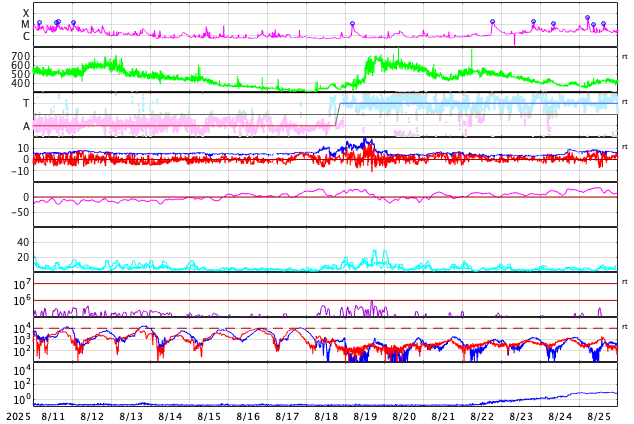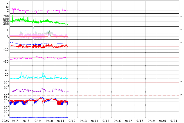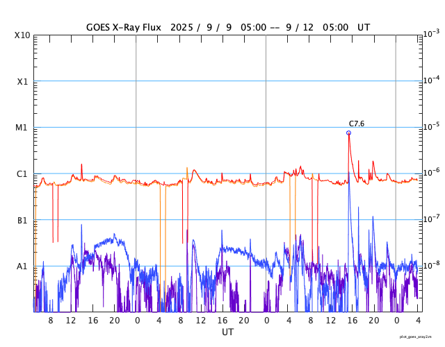 GOES衛星の太陽X線強度。赤・橙 = 0.1〜0.8 nm、青・紫 = 0.05〜0.4 nm (c) データ:NOAA/SWPC、作図:宇宙天気ニュース ![]() | ||||||||||||||||||||||||||||||||||||||||||||||||||||||||||||||||||||||||||||||||||||||||||||||||||||||||||||||||||||||||||||||||||||||||||||||||||||||||||||||||||||||||||||||||||||||||||||||||||||||||||||||||||||||||||||||||||||||||||