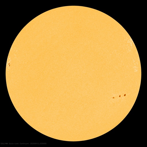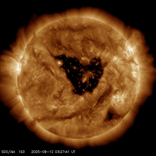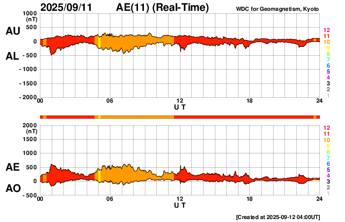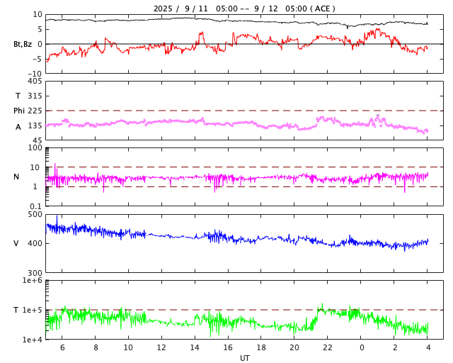 2025/ 9/12 13:13 更新 太陽風は平均的な速度です。コロナホールの影響が近付いています。イエローナイフのオーロラをどうぞ。 担当 篠原 景山植光さんより、カナダ・イエローナイフで撮影されたばかりの オーロラの写真をいただきました。 撮影時刻は、現地11日1時(世界時11日7時)で、 今日掲載している太陽風やAE指数の図と見比べて下さい。 撮影の頃、太陽風の速度は450km/秒と平均的な状態で、 磁場は弱い南寄りになっていました。 磁気圏は、ある程度活動的だった様で、 AE指数は500nTの中規模の変化がしばらく続いています。 景山さんの写真では、激しい変化ではありませんが、 オーロラの緑色の光がきれいに写っています。 景山さんによると、 イエローナイフの天空いっぱいに広がったオーロラを 堪能した夜だったとのことです。 3枚目では、明るい月に照らされた雲も写っています。 この雲と比較することで、オーロラの本当の明るさが実感できる様です。 また、5枚目では、右端にプレアデス星団、中央上側にカシオペヤ座、 左下に北斗七星が写っています。 空のかなり広い範囲を撮っていることが分かります。 景山さんには、昨年の9月にもオーロラの写真を送っていただきました。 前回に続いて素晴らしい夜を迎えている様です。 どうもありがとうございます。 現在の太陽風は、450km/秒から400km/秒へ速度が少し下がっています。 平均的な速さです。 磁場強度は、7〜8nTと少し強まった状態です。 磁場の南北成分は、 弱い南寄りからやや北寄りに傾向が変わっています。 このため磁気圏の活動は次第に穏やかになっていて、 AE指数は、初めの頃は500nTの変化が起きていますが、 変化は次第に小さくなって、現在は変化が見られなくなっています。 SDO衛星AIA193では、 太陽の中心にコロナホールが大きく広がっています。 先頭(右端)は太陽の西側(右側)に進んでいて、 明日くらいから高速の太陽風がやって来る可能性があります。 太陽風の速度はどのくらいまで高まるでしょうか。 注目して下さい。 太陽は、12日0時(世界時11日15時)に、 北西の端(右上)に達した4207黒点群で、 C7.6と大きめの小規模フレアが発生しています。 4207群はこの後向こう側に進んで、見えなくなります。 東端(左端)には4216群が見えています。 今のところ、C1台の小さいフレアが発生した程度です。 ![]() カナダ・イエローナイフで、現地11日1時5分(世界時11日7時5分)に撮影されたオーロラ。 (c) 景山植光氏 ![]() カナダ・イエローナイフで、現地11日1時7分(世界時11日7時7分)に撮影されたオーロラ。 (c) 景山植光氏 ![]() カナダ・イエローナイフで、現地11日1時17分(世界時11日7時17分)に撮影されたオーロラ。 (c) 景山植光氏 ![]() カナダ・イエローナイフで、現地11日1時32分(世界時11日7時32分)に撮影されたオーロラ。 (c) 景山植光氏 ![]() カナダ・イエローナイフで、現地11日1時33分(世界時11日7時33分)に撮影されたオーロラ。 (c) 景山植光氏 ![]() SDO衛星のAIA193カメラによる太陽コロナの様子 (c) SDO (NASA) ![]() SDO衛星による太陽の可視光写真。マウスの矢印を写真に重ねると、黒点番号付きの写真に切り替わります。 (c) SDO (NASA) ![]() ACEが観測した太陽風の磁場(黒線は全体の強度、赤線は南北成分) 磁場の向き、プラズマの密度、速度、温度 (c) データ:NOAA/SWPC、作図:宇宙天気ニュース ![]() AE指数(速報値) 下段のAEグラフの値が高くなると、オーロラ活動が活発化しています。 (c) 京都大学WDC ![]() ![]() 27日の太陽周期に合わせた図 太陽が同じ面を地球に向けていた27日前の変化から、今後を予想することができます。 (c) 作図:宇宙天気ニュース