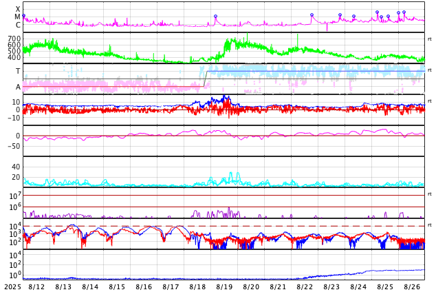 GOES衛星の太陽X線強度。赤・橙 = 0.1〜0.8 nm、青・紫 = 0.05〜0.4 nm (c) データ:NOAA/SWPC、作図:宇宙天気ニュース ![]() | ||||||||||||||||||||||||||||||||||||||||||||||||||||||||||||||||||||||||||||||||||||||||||||||||||||||||||||||||||||||||||||||||||||||||||||||||||||||||||||||||||||||||||||||||||||||||||||||||||||||||||||||||||||||||||||||||||||