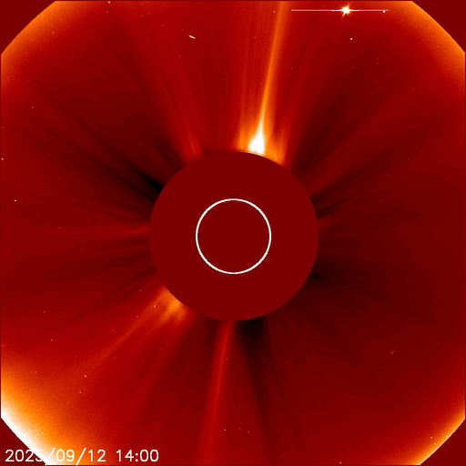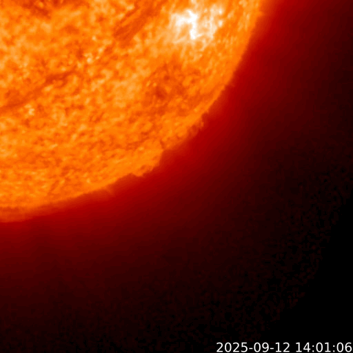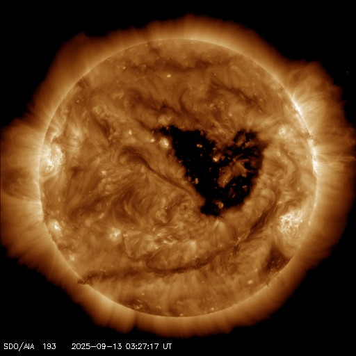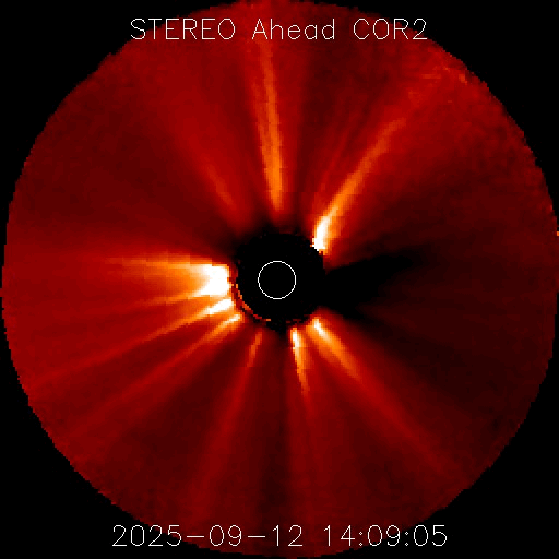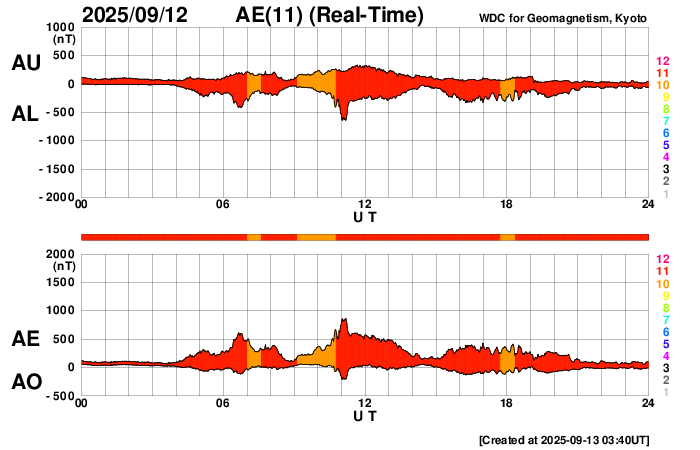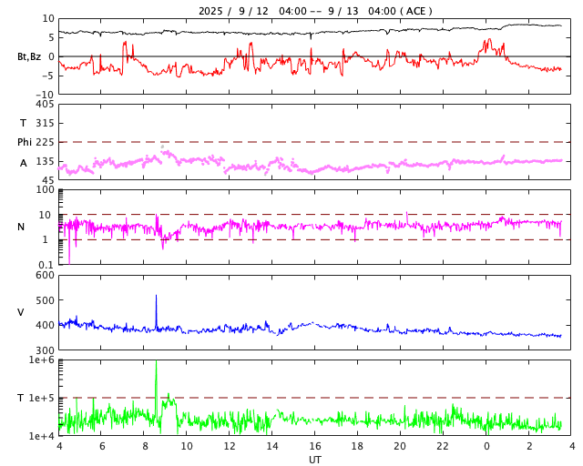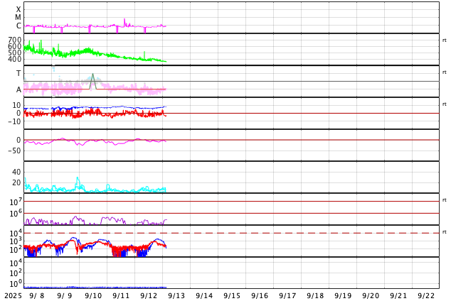2025/ 9/13 12:46 更新 太陽風は360km/秒と低速になっています。コロナホールの影響が近付いています。 担当 篠原 太陽風は、速度が400km/秒から360km/秒へ下がり、 低速になっています。 磁場強度は、6nTで安定していましたが、 グラフの後半で8nTに少し強まっています。 磁場の南北成分は、南寄りの傾向が続いています。 磁気圏の活動はある程度高まっていて、 AE指数は500nT前後の中、小規模の変化が続いています。 現在は速度が下がっているので、影響は小さくなりそうです。 SDO衛星AIA193の太陽コロナ写真を見ると、 コロナホールは太陽の西側に半分ほど進んでいて、 地球に影響が及び始める目安の位置に達しています。 この後、この領域から吹き出している 速度の高い太陽風が地球に到来すると思われます。 太陽風の磁場が強まって、南向きに大きく変化すると、 速度の高まりとともに磁気圏の活動が強まります。 注目して下さい。 太陽のX線グラフは、 目立った変化はなく穏やかに推移しています。 一方、GOES衛星SUVI 304によると、 昨夜、12日23時半(世界時12日14時半)頃に、 南西の端(右下)から大きい噴出が発生しています。 太陽の向こう側で発生した現象です。 SOHO衛星LASCO C2、C3では、 太陽の下に向かって広がるCME(コロナ質量放出)が観測されています。 横向きの噴出なので、地球への影響はありません。 太陽を地球よりも右斜めから観測している STEREO Ahead衛星のCOR2では、 CMEは太陽の右下寄りに飛び出しています。 太陽の向こう側で発生したことを示しています。