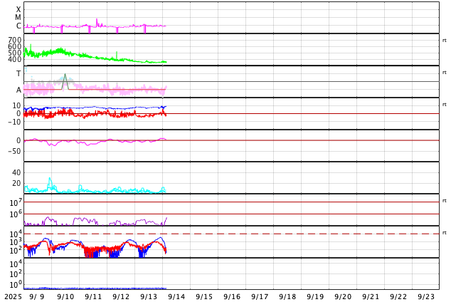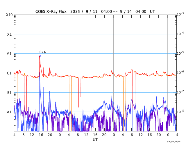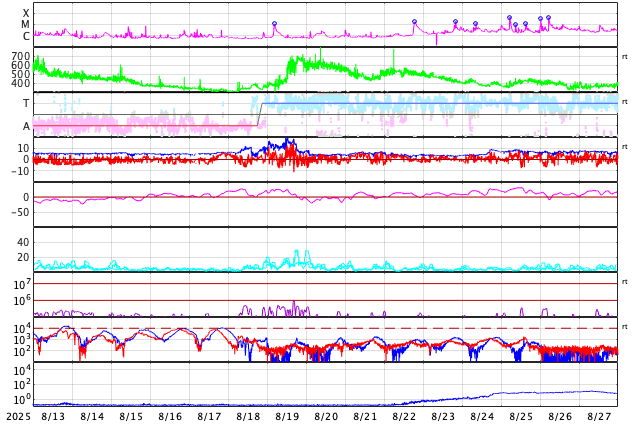 GOES衛星の太陽X線強度。赤・橙 = 0.1〜0.8 nm、青・紫 = 0.05〜0.4 nm (c) データ:NOAA/SWPC、作図:宇宙天気ニュース ![]() | ||||||||||||||||||||||||||||||||||||||||||||||||||||||||||||||||||||||||||||||||||||||||||||||||||||||||||||||||||||||||||||||||||||||||||||||||||||||||||||||||||||||||||||||||||||||||||||||||||||||||||||||||||||||||||||