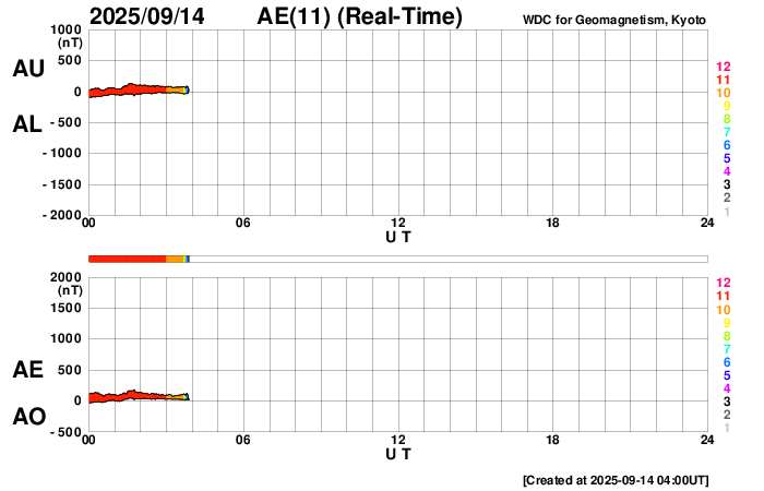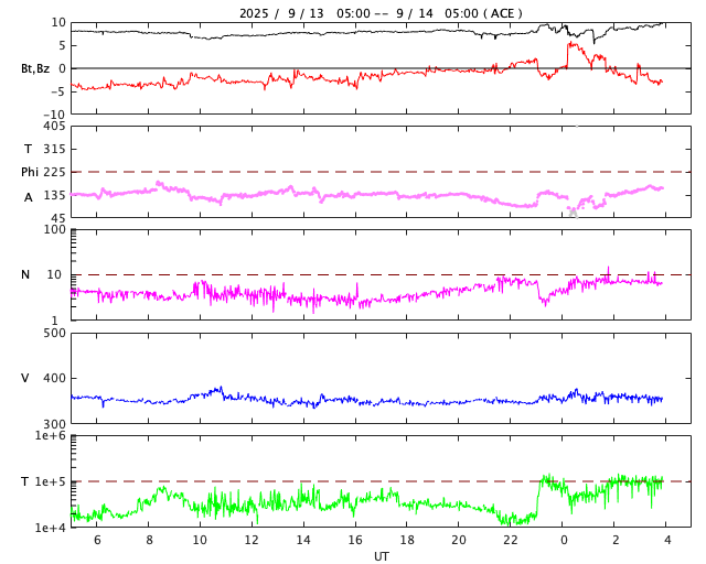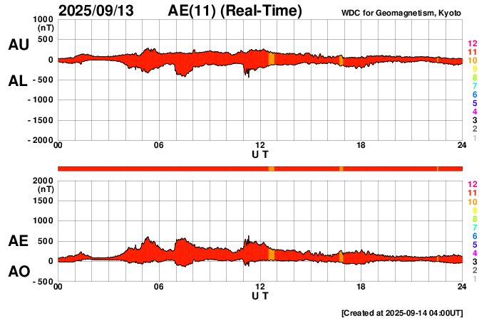 2025/ 9/14 13:01 更新 太陽風は低速の状態が続いています。イエローナイフのオーロラをどうぞ。 担当 篠原 カナダ・イエローナイフに滞在中の景山植光さんより、 現地12〜13日のオーロラの写真をいただきました。 太陽風の速度は350km/秒と下がった状態ですが、 磁場の南北成分は -4nTと南向きの状態がしばらく続き、 AE指数では、500nTの中規模の変化が発生していました。 1、2枚目の写真は、AE指数のグラフの1つめの高まり、 3〜5枚目の写真は、2つめの高まりと、 観測データに対応するタイミングで撮影されています。 上空から降り注ぐような光の帯がとてもきれいです。 この後、高速の太陽風が到来すると、 一段と活発なオーロラが現れそうです。 素晴らしい速報をどうもありがとうございます。 太陽風は、350km/秒と低速の状態が続いています。 磁場強度は、8nTで安定していましたが、 グラフの最後で10nT近くに少し上がっています。 SDO衛星AIA193の北西側(右上)に広がっている コロナホールの影響はまだ到来していません。 SDO衛星の更新が止まっていて、掲載している写真は昨夜の撮影です。 このため、現在のコロナホールは、 この写真よりももう少し西側(右側)に進んでいます。 高速太陽風の到来は近いと思いますが、 どこから変化が始まるか、引き続き注目してください。 太陽風磁場の南北成分は、 グラフの前半は南寄り、後半は0nT付近で変化しています。 磁気圏の活動はこれに対応していて、 AE指数は、初めの頃は500nTの中規模の変化が発生していますが、 後半は変化がなくなり、穏やかになっています。 太陽は、目立つ規模のフレアの発生はなく、 穏やかな状態が続いています。