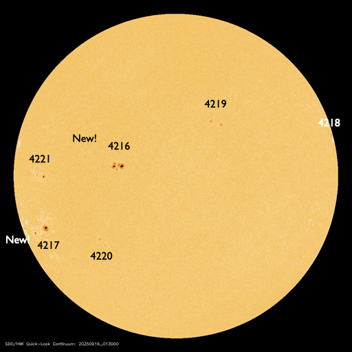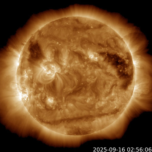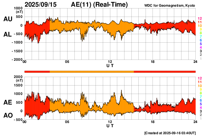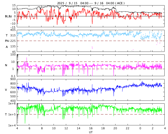 2025/ 9/16 12:46 更新 太陽風の速度は750km/秒に高まっています。磁気圏も活動的です。 担当 篠原 太陽風の速度は、昨夕に600km/秒へ下がりましたが、 今日に入る頃から再び上昇して、 今朝以降、750km/秒と昨日よりも高速になっています。 一方、磁場強度は、10nTから15nTへ強まりましたが、 今朝早くに5nTへ下がり、平均的な値に戻っています。 磁場の南北成分は、 昨日のニュース以降は比較的北寄りになっています。 南向きの変化も発生しているので、 磁気圏の活動は強まっていますが、 AE指数を見ると、500〜1000nTの中規模の変化が続く程度です。 速度の高まりと比べると、大きな変化にはなっていません。 GOES衛星SUVI 195の太陽コロナ写真では、 コロナホールは西の端(右端)に達しています。 高速の太陽風はどのくらい続くでしょうか。 注目して下さい。 太陽は穏やかで、 X線グラフは、C3.5の小規模フレアが発生した程度です。 可視光写真では、黒点が少し増えています。 ![]() GOES衛星SUVI 195カメラによる太陽コロナの様子 (c) GOES衛星SUVI 195 (NOAA) ![]() SDO衛星による太陽の可視光写真。SOHO衛星のWebページより取得しました。 (c) SDO (NASA) ![]() ACEが観測した太陽風の磁場(黒線は全体の強度、赤線は南北成分) 磁場の向き、プラズマの密度、速度、温度 (c) データ:NOAA/SWPC、作図:宇宙天気ニュース ![]() AE指数(速報値) 下段のAEグラフの値が高くなると、オーロラ活動が活発化しています。 (c) 京都大学WDC ![]() ![]() 27日の太陽周期に合わせた図 太陽が同じ面を地球に向けていた27日前の変化から、今後を予想することができます。 (c) 作図:宇宙天気ニュース
