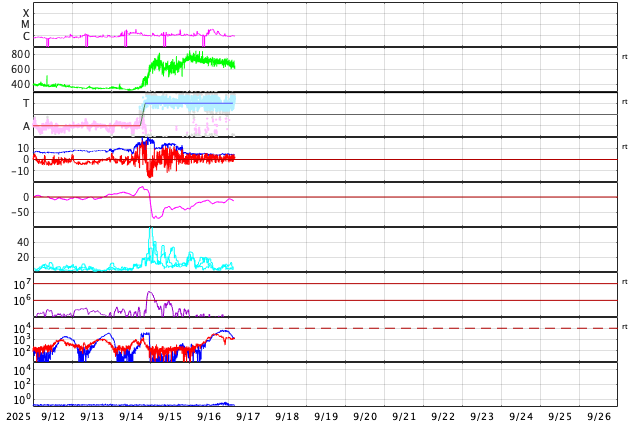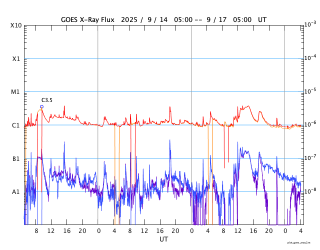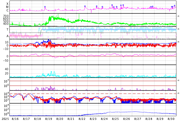 GOES衛星の太陽X線強度。赤・橙 = 0.1〜0.8 nm、青・紫 = 0.05〜0.4 nm (c) データ:NOAA/SWPC、作図:宇宙天気ニュース ![]() | ||||||||||||||||||||||||||||||||||||||||||||||||||||||||||||||||||||||||||||||||||||||||||||||||||||||||||||||||||||||||||||||||||||||||||||||||||||||||||||||||||||||||||||||||||||||||||||||||||||||||||||||||||||||||||||||||||||||||||||||||||||||||||||||