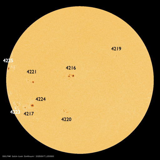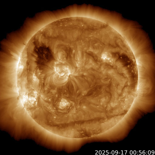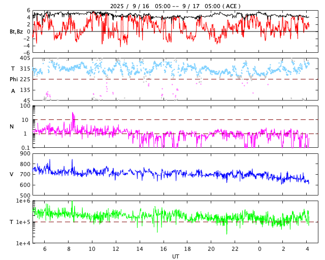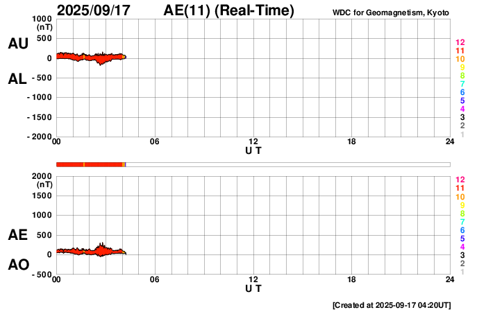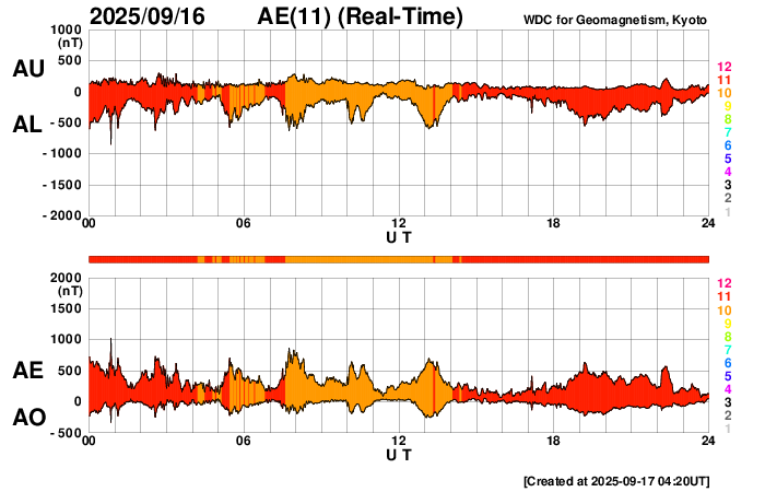 2025/ 9/17 13:30 更新 高速の太陽風が続いています。イエローナイフのオーロラをどうぞ。 担当 篠原 カナダ・イエローナイフに滞在中の景山植光さんより、 現地16日1時半(世界時16日7時半)に撮影された オーロラの写真をいただきました。 現地の14日夜に今回の高速太陽風が始まったのですが、 この夜は雲が厚く、オーロラの姿はほとんど見ることができなかったそうです。 掲載の夜は、前半は薄い雲を通してのオーロラ観賞で、 後半は晴れ間でブレークアップを見ることができたそうです。 掲載している4枚は、1分半ほどの間の連続撮影です。 1、2枚目の間でカメラを少し右に動かしていますが、 同じオーロラの変化を追いかけていると言えそうです。 形の変化や赤い光の強まりなど、現地の様子を想像して下さい。 晴れ間で捉えた貴重な写真をどうもありがとうございます。 明日のニュースで続きの写真を紹介します。 太陽風の速度は、750km/秒から650km/秒にゆっくりと下がっていますが、 高速の状態は続いています。 磁場強度は、4〜5nTと平均的な状態です。 磁場の南北成分は、南北に変化していますが、 全体としては北寄りになっていて、南向きの変化は少なくなっています。 このため、太陽風の速度はかなり高いのですが、 磁気圏の活動は次第に小さくなっていて、 AE指数は、初めは800nTくらいの変化が発生していますが、 次第に500nTくらいになり、後半は変化が見られなくなっています。 SDO衛星のページはサーバーが故障したそうで、 復旧にしばらくかかりそうです。 太陽コロナ写真として、GOES衛星SUVI 195を掲載しています。 現在の高速太陽風の発生源と思われるコロナホールは、 西の端(右端)に見えています。 太陽風速度の高まりは、終わりに向かいそうです。 一方、北東側(左上)に別のコロナホールが見えています。 27日前の前周期にもこの領域は見えていたのですが、 太陽風速度の高まりはほとんど見られませんでした。 今回はどうなるでしょうか。 9月22日頃の変化に注目して下さい。 太陽は、南東(左下)の4223黒点群でC3.8の小規模フレアが発生し、 X線グラフに時間の長い高まりを作っています。 目立つ変化はこのくらいで、 太陽は比較的穏やかな状態です。 ![]() カナダ・イエローナイフで、現地16日1時25分(世界時16日7時25分)に撮影されたオーロラ。 (c) 景山植光氏 ![]() カナダ・イエローナイフで、現地16日1時26分(世界時16日7時26分)に撮影されたオーロラ。 (c) 景山植光氏 ![]() カナダ・イエローナイフで、現地16日1時26分(世界時16日7時26分)に撮影されたオーロラ。 (c) 景山植光氏 ![]() カナダ・イエローナイフで、現地16日1時27分(世界時16日7時27分)に撮影されたオーロラ。 (c) 景山植光氏 ![]() GOES衛星SUVI 195カメラによる太陽コロナの様子 (c) GOES衛星SUVI 195 (NOAA) ![]() SDO衛星による太陽の可視光写真。SOHO衛星のWebページより取得しました。 (c) SDO (NASA) ![]() ACEが観測した太陽風の磁場(黒線は全体の強度、赤線は南北成分) 磁場の向き、プラズマの密度、速度、温度 (c) データ:NOAA/SWPC、作図:宇宙天気ニュース ![]() AE指数(速報値) 下段のAEグラフの値が高くなると、オーロラ活動が活発化しています。 (c) 京都大学WDC ![]() ![]() 27日の太陽周期に合わせた図 太陽が同じ面を地球に向けていた27日前の変化から、今後を予想することができます。 (c) 作図:宇宙天気ニュース