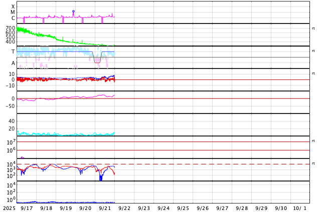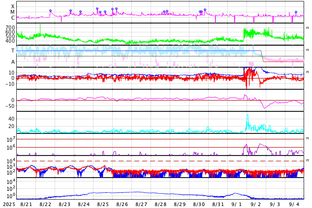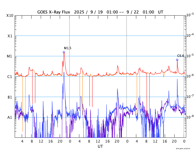 GOES衛星の太陽X線強度。赤・橙 = 0.1〜0.8 nm、青・紫 = 0.05〜0.4 nm (c) データ:NOAA/SWPC、作図:宇宙天気ニュース ![]() | |||||||||||||||||||||||||||||||||||||||||||||||||||||||||||||||||||||||||||||||||||||||||||||||||||||||||||||||||||||||||||||||||||||||||||||||||||||||||||||||||||||||||||||||||||||||||||||||||||||||||||||||||||||||||||||||||||||||||||||||||||||||||||||||