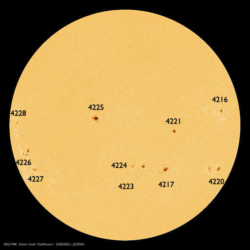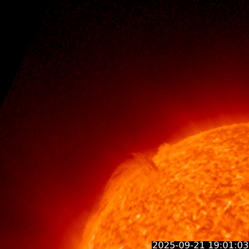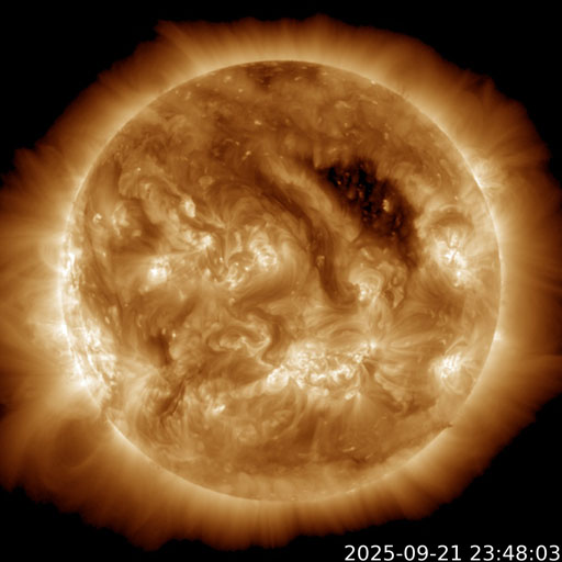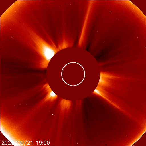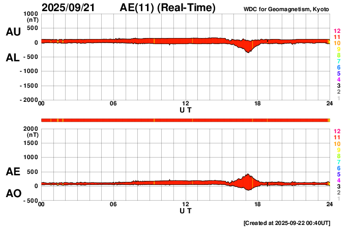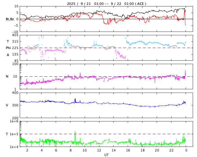 2025/ 9/22 10:00 更新 太陽風は低速の状態が続いています。コロナホールの影響が始まる可能性があります。 担当 篠原 太陽風の速度は、330km/秒から290km/秒へ更に低下し、 グラフの最後で320km/秒へ少し上がっています。 低速の状態は続いています。 磁場強度は、初めは2nTに下がっていましたが、 その後は5〜8nTくらいで推移しています。 GOES衛星SUVI 195では、 コロナホールは北西側(右上)にだいぶ進んでいます。 この領域の影響の到来が近付いている可能性があります。 太陽風の磁場強度や速度の変化に注目して下さい。 磁気圏は穏やかな状態が続いています。 AE指数は、300nTの小規模の変化が1回発生した程度です。 太陽は、中心部南側の4223黒点群で C6.6の小規模フレアが発生しています。 また、GOES衛星SUVI 304によると、 太陽の北東の端(左上)と南西の端(右下)で 連続するようにプロミネンス噴出が発生しています。 動画を掲載しますが、なかなか見応えのある噴出です。 SOHO衛星LASCO C2では、 南西側の噴出によるCME(コロナ質量放出)が良く見えています。 横向きの噴出なので、地球への影響はありません。 ![]() 太陽の北東側と南西側で発生したプロミネンス噴出。 (c) GOES衛星SUVI 304 (NOAA)、(動画加工 : 宇宙天気ニュース) ![]() 太陽の右下へCMEが広がり始めています。 (c) SOHO衛星LASCO C2 (ESA & NASA)、(動画加工 : 宇宙天気ニュース) ![]() GOES衛星SUVI 195カメラによる太陽コロナの様子 (c) GOES衛星SUVI 195 (NOAA) ![]() SDO衛星による太陽の可視光写真。SOHO衛星のWebページより取得しました。 (c) SDO (NASA) ![]() ACEが観測した太陽風の磁場(黒線は全体の強度、赤線は南北成分) 磁場の向き、プラズマの密度、速度、温度 (c) データ:NOAA/SWPC、作図:宇宙天気ニュース ![]() AE指数(速報値) 下段のAEグラフの値が高くなると、オーロラ活動が活発化しています。 (c) 京都大学WDC ![]() ![]() 27日の太陽周期に合わせた図 太陽が同じ面を地球に向けていた27日前の変化から、今後を予想することができます。 (c) 作図:宇宙天気ニュース
