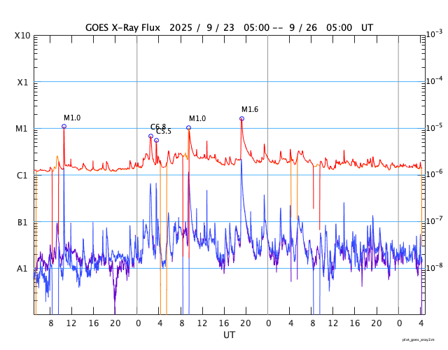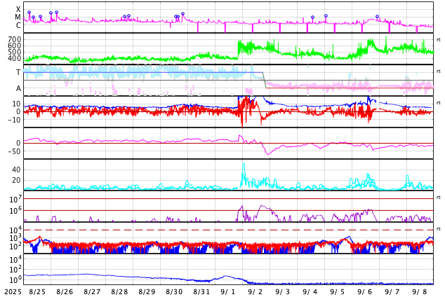 GOES衛星の太陽X線強度。赤・橙 = 0.1〜0.8 nm、青・紫 = 0.05〜0.4 nm (c) データ:NOAA/SWPC、作図:宇宙天気ニュース ![]() | ||||||||||||||||||||||||||||||||||||||||||||||||||||||||||||||||||||||||||||||||||||||||||||||||||||||||||||||||||||||||||||||||||||||||||||||||||||||||||||||||||||||||||||||||||||||||||||||||||||||||||||||||||||||||||||||||||||||||||||||||||||||||||||||||||||||||||||||