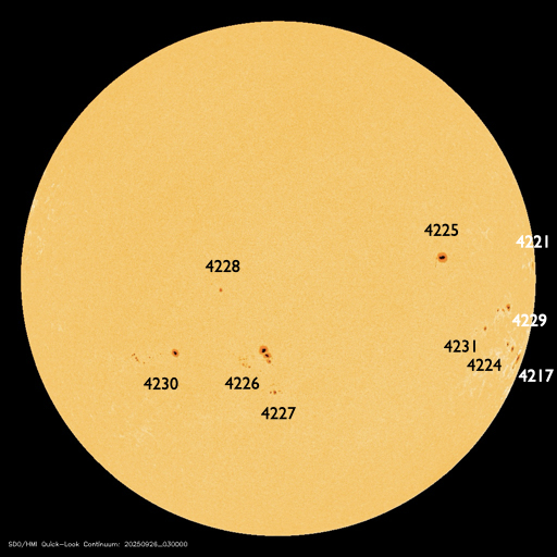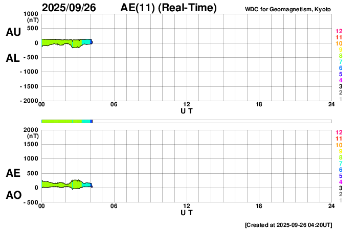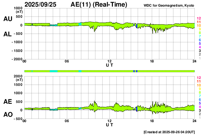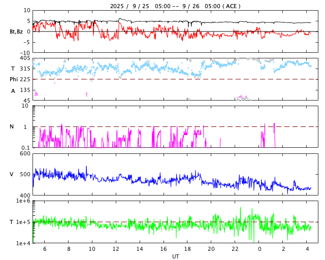 2025/ 9/26 13:37 更新 太陽風は平均的な速度に戻っています。イエローナイフの21日夜のオーロラをどうぞ。 担当 篠原 景山植光さんよりお送りいただいた、 21日夜のカナダ・イエローナイフのオーロラの最後の4枚です。 1、2枚目は、昨日の写真の続きです。 赤と緑の光の重なりがとてもきれいです。 そして、3、4枚目は、1時間半ほど過ぎた後の撮影です。 一直線に空を切り裂くような光り方が印象的です。 前の写真と比べると、この時は赤い光がより目立っている様に感じます。 この時も太陽風の速度は350km/秒と低速でしたが、 見事なオーロラの活動です。 9月12日から2週間にかけてオーロラの紹介をさせていただきました。 興味深い情報をどうもありがとうございます。 太陽風は、500km/秒から430km/秒へ速度が下がり、 平均的な速度に戻っています。 磁場強度は、5nTから4nTへ少し下がっています。 こちらも平均的な状態です。 磁場の南北成分は、弱い南寄りになっています。 速度が下がってきた事もあって、磁気圏への影響は限定的ですが、 AE指数は、300〜500nTの小規模の変化が次々に発生しています。 GOES衛星SUVI 195では、 コロナホールは特に見えていません。 太陽風は、しばらく穏やかな状態が続きそうです。 X線グラフは目立った変化はなく、 太陽は穏やかになっています。 ![]() カナダ・イエローナイフで、現地21日23時21分(世界時22日5時21分)に撮影されたオーロラ。 (c) 景山植光氏 ![]() カナダ・イエローナイフで、現地21日23時22分(世界時22日5時22分)に撮影されたオーロラ。 (c) 景山植光氏 ![]() カナダ・イエローナイフで、現地22日1時49分(世界時22日7時49分)に撮影されたオーロラ。 (c) 景山植光氏 ![]() カナダ・イエローナイフで、現地22日1時50分(世界時22日7時50分)に撮影されたオーロラ。 (c) 景山植光氏 ![]() GOES衛星SUVI 195カメラによる太陽コロナの様子 (c) GOES衛星SUVI 195 (NOAA) ![]() SDO衛星による太陽の可視光写真。SOHO衛星のWebページより取得しました。 (c) SDO (NASA) ![]() ACEが観測した太陽風の磁場(黒線は全体の強度、赤線は南北成分) 磁場の向き、プラズマの密度、速度、温度 (c) データ:NOAA/SWPC、作図:宇宙天気ニュース ![]() AE指数(速報値) 下段のAEグラフの値が高くなると、オーロラ活動が活発化しています。 (c) 京都大学WDC ![]() ![]() 27日の太陽周期に合わせた図 太陽が同じ面を地球に向けていた27日前の変化から、今後を予想することができます。 (c) 作図:宇宙天気ニュース