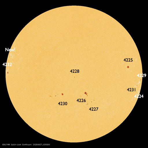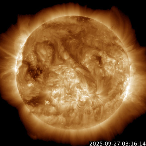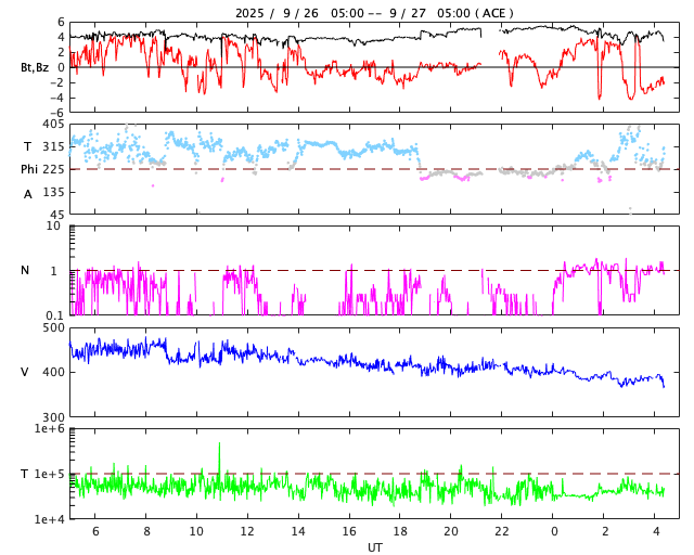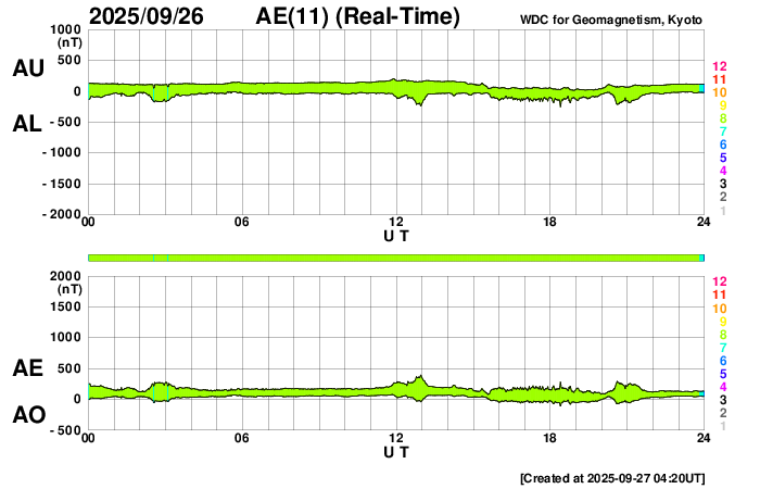 2025/ 9/27 13:34 更新 太陽風はやや低速になっています。イエローナイフの23日未明のオーロラをどうぞ。 担当 篠原 今日は、四十万智博さんよりいただいたオーロラの写真を掲載します。 撮影は、イエローナイフからバンクーバーへ向かう機内からで、 写真の左下に主翼の先が微かに写っています。 9月22〜25日にやって来た高速太陽風の 速度が最も高まっていた世界時23日12時33分の撮影です。 四十万さんによると、 コロナホールの影響に期待していたもののイエローナイフは小雨が降る天気で、 直後に乗ったバンクーバー行きの飛行機の中から オーロラを見ることができたとのことです。 撮影条件の厳しい中での貴重な一枚です。 この頃の太陽風は550km/秒と高速で、 AE指数では、800nTの変化が発生したタイミングでした。 機内であっても、実際に見えたのは素晴らしいことだと思います。 どうもありがとうございます。 太陽風の速度は450km/秒から380km/秒へ低下して、 やや低速になっています。 磁場強度は4nT付近で推移しています。 磁気圏は概ね静穏で、 AE指数は小規模の変化が起きているくらいです。 GOES衛星SUVI 195では、 東側(左側)の赤道付近と南側にコロナホールが見えています。 南東の領域は27日前の前周期にも見えていて、 この時は、6日後にあたる9月6日から高速太陽風がやって来ました。 今回はどうなるでしょうか。 太陽は、X線グラフの後半からフレアが多発するようになっています。 今朝、27日4時(世界時26日20時)に、 北西の端(右上)の4221黒点群でC7.8の小規模フレア、 直後の27日5時(世界時26日20時)に、 北東の端(左上)でM1.6の中規模フレアと発生し、 しばらく経って、中心部南側の4226黒点群で、 27日9時半(世界時27日0時半)にC8.0の小規模フレア、 27日12時半(世界時27日3時半)にM1.0の中規模フレア、 などと続いています。 GOES衛星SUVI 131の動画を掲載します。 フレアはこの後も続くでしょうか。 注目して下さい。 ![]() イエローナイフからバンクーバーへ向かう機内から、世界時23日12時33分に撮影されたオーロラ。 (c) 四十万智博氏 ![]() 4221黒点群で発生したC7.8の小規模フレアと北東の端で発生したM1.6の中規模フレア。 (c) GOES衛星SUVI 131 (NOAA)、(動画加工 : 宇宙天気ニュース) ![]() 4226黒点群で発生した、C8.0の小規模フレアとM1.0の中規模フレア。 (c) GOES衛星SUVI 131 (NOAA)、(動画加工 : 宇宙天気ニュース) ![]() GOES衛星SUVI 195カメラによる太陽コロナの様子 (c) GOES衛星SUVI 195 (NOAA) ![]() SDO衛星による太陽の可視光写真。SOHO衛星のWebページより取得しました。 (c) SDO (NASA) ![]() ACEが観測した太陽風の磁場(黒線は全体の強度、赤線は南北成分) 磁場の向き、プラズマの密度、速度、温度 (c) データ:NOAA/SWPC、作図:宇宙天気ニュース ![]() AE指数(速報値) 下段のAEグラフの値が高くなると、オーロラ活動が活発化しています。 (c) 京都大学WDC ![]() ![]() 27日の太陽周期に合わせた図 太陽が同じ面を地球に向けていた27日前の変化から、今後を予想することができます。 (c) 作図:宇宙天気ニュース