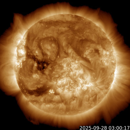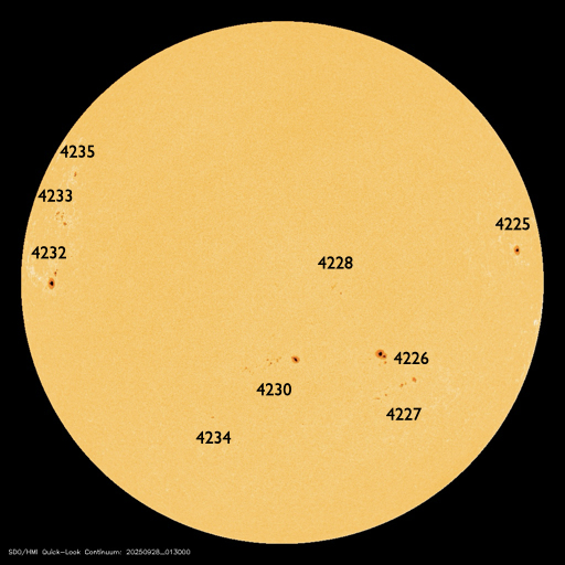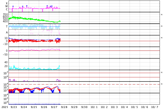 2025/ 9/28 12:32 更新 太陽風は平均的な速度で、磁気圏は概ね静穏です。 担当 篠原 太陽風の速度は、一旦360km/秒まで下がりましたが、 今朝から少し上がって、現在は410km/秒と平均的な速さに戻っています。 磁場強度は5nTから少し上がって、8nT前後で推移しています。 磁気圏は概ね静穏ですが、 太陽風の磁場が南向きに変化した頃に、 AE指数で500nTの中規模の変化が発生しています。 GOES衛星SUVI 195の太陽コロナ写真では、 東側(左側)の赤道付近と南半球側にコロナホールが見えています。 5日後くらいから、 この領域の影響で太陽風の速度が高まる可能性があります。 太陽は、北東の端(左上)に4232、4233、4235と3つの黒点群が現れています。 4232群では、M1.1、C6.8、C7.6、 4233群では、C3.2、C3.0、C7.3、C3.1、 4235群では、C5.4、 などの中規模、小規模フレアが次々に発生しています。 X線グラフでは、グラフの最後はフレアが少なくなっていますが、 この後のフレアの発生に注目して下さい。
