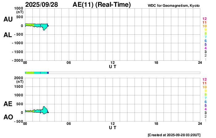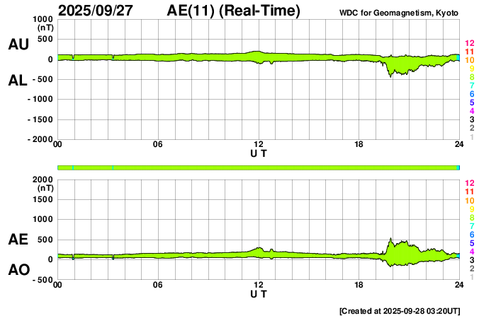 (c) GOES衛星SUVI 195 (NOAA) ![]() SDO衛星による太陽の可視光写真。SOHO衛星のWebページより取得しました。 (c) SDO (NASA) ![]() ACEが観測した太陽風の磁場(黒線は全体の強度、赤線は南北成分) 磁場の向き、プラズマの密度、速度、温度 (c) データ:NOAA/SWPC、作図:宇宙天気ニュース ![]() AE指数(速報値) 下段のAEグラフの値が高くなると、オーロラ活動が活発化しています。 (c) 京都大学WDC ![]() ![]() 27日の太陽周期に合わせた図 太陽が同じ面を地球に向けていた27日前の変化から、今後を予想することができます。 (c) 作図:宇宙天気ニュース