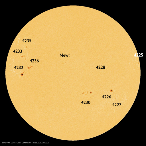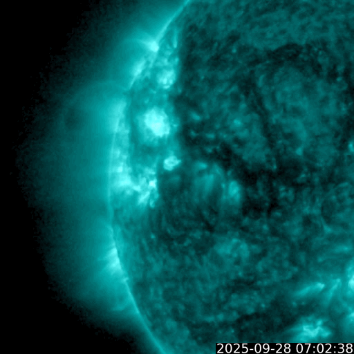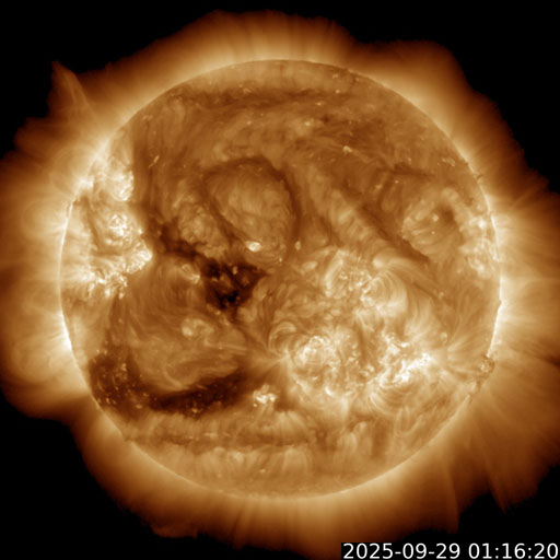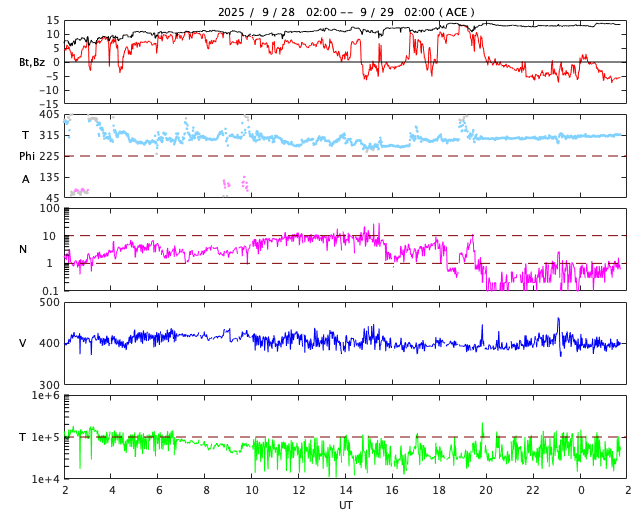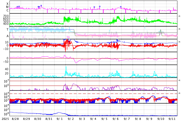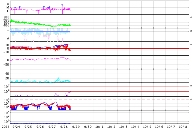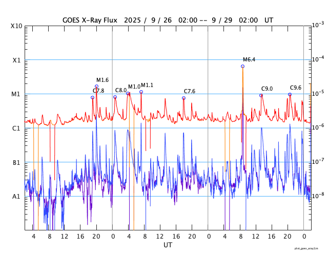 2025/ 9/29 10:55 更新 M6.4の中規模フレアが発生しました。太陽風の磁場が強まっています。 担当 篠原 昨夕、28日17時半(世界時28日8時半)に、 太陽の北東側(左上)の4232黒点群で、 M6.4と大きめの中規模フレアが発生しました。 M6の規模に達するフレアの発生は、 世界時6月19日のX1.9以来で、およそ3か月ぶりです。 GOES衛星SUVI 131の動画を掲載します。 太陽では、この後も北東側でフレアの発生が続いています。 4232群では、C3.0、C3.7、C7.4などの小規模フレア、 上側に見える4233群では、C9.0、C9.9、C9.6と Mクラス寸前の小規模フレアなど、 もう一つ上側の4235群でもC5.5の小規模フレアが発生しています。 この後の活動に注目して下さい。 太陽風は、400km/秒と平均的な速度が続いています。 磁場強度は、8nTから次第に強まって、 現在は14nTに達しています。 磁場の南北成分は、北向きに強まる時間帯が続きましたが、 グラフの最後で南向きに変化しています。 磁気圏は比較的穏やかな状態が続いていますが、 この後、活動が少し強まるかもしれません。 GOES衛星SUVI 195では、 コロナホールが太陽の中心線に近付いています。 4日後くらいからこれらの領域の影響が始まりそうです。
