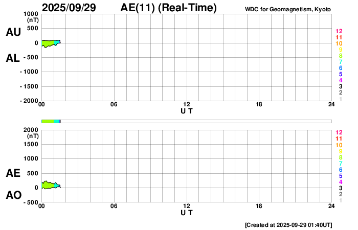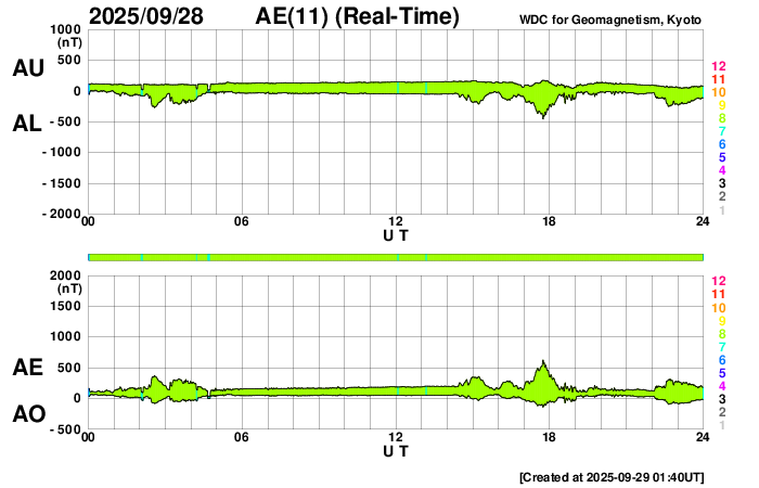 (c) GOES衛星SUVI 131 (NOAA)、(動画加工 : 宇宙天気ニュース) ![]() GOES衛星SUVI 195カメラによる太陽コロナの様子 (c) GOES衛星SUVI 195 (NOAA) ![]() SDO衛星による太陽の可視光写真。SOHO衛星のWebページより取得しました。 (c) SDO (NASA) ![]() GOES衛星の太陽X線強度。赤・橙 = 0.1〜0.8 nm、青・紫 = 0.05〜0.4 nm (c) データ:NOAA/SWPC、作図:宇宙天気ニュース ![]() ACEが観測した太陽風の磁場(黒線は全体の強度、赤線は南北成分) 磁場の向き、プラズマの密度、速度、温度 (c) データ:NOAA/SWPC、作図:宇宙天気ニュース ![]() AE指数(速報値) 下段のAEグラフの値が高くなると、オーロラ活動が活発化しています。 (c) 京都大学WDC ![]() ![]() 27日の太陽周期に合わせた図 太陽が同じ面を地球に向けていた27日前の変化から、今後を予想することができます。 (c) 作図:宇宙天気ニュース