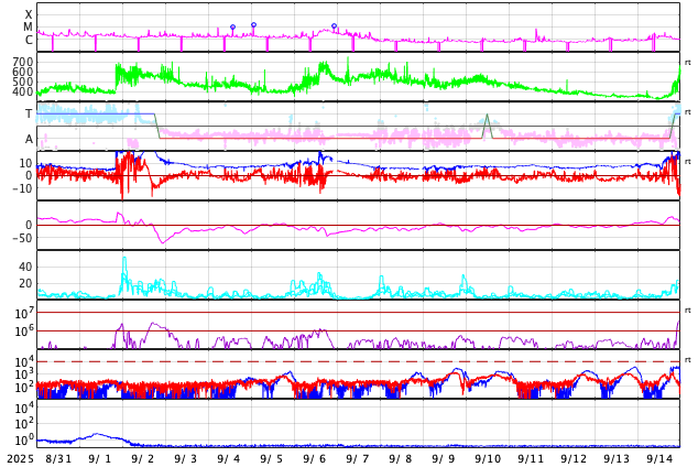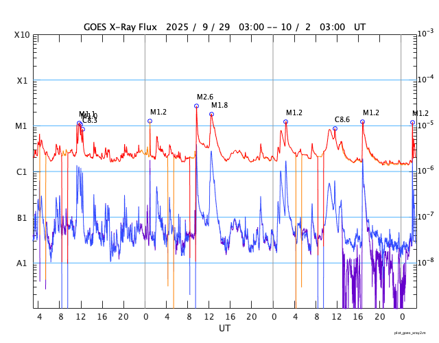 GOES衛星の太陽X線強度。赤・橙 = 0.1〜0.8 nm、青・紫 = 0.05〜0.4 nm (c) データ:NOAA/SWPC、作図:宇宙天気ニュース ![]() | ||||||||||||||||||||||||||||||||||||||||||||||||||||||||||||||||||||||||||||||||||||||||||||||||||||||||||||||||||||||||||||||||||||||||||||||||||||||||||||||||||||||||||||||||||||||||||||||||||||||||||||||||||||||||||||||||||||||||||||||||||||||||||||||||||||||||||||||||||||||||||||