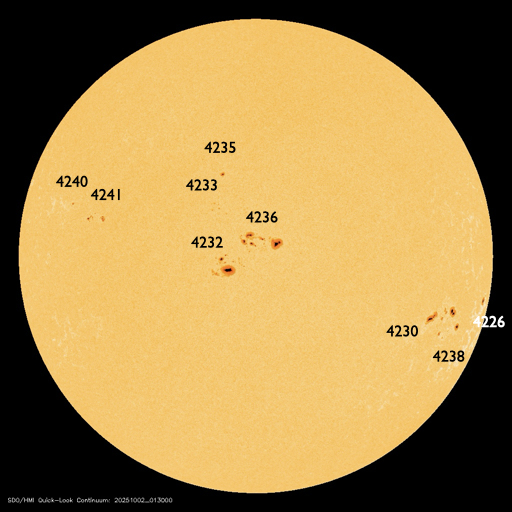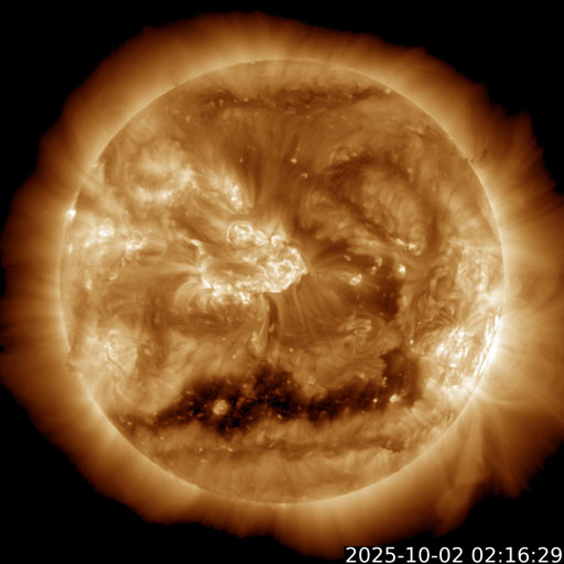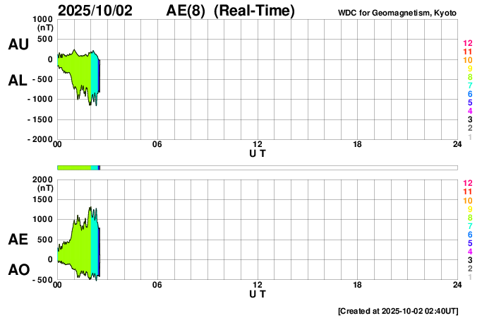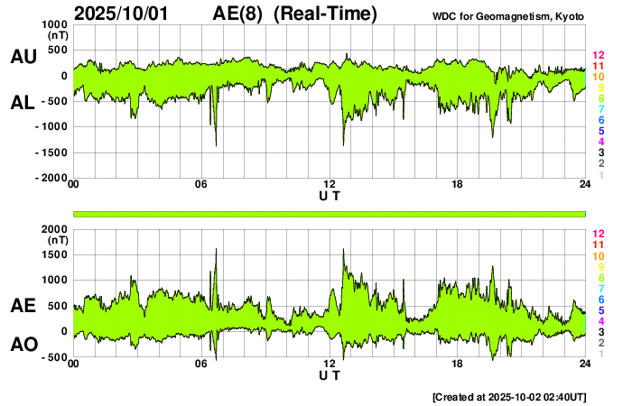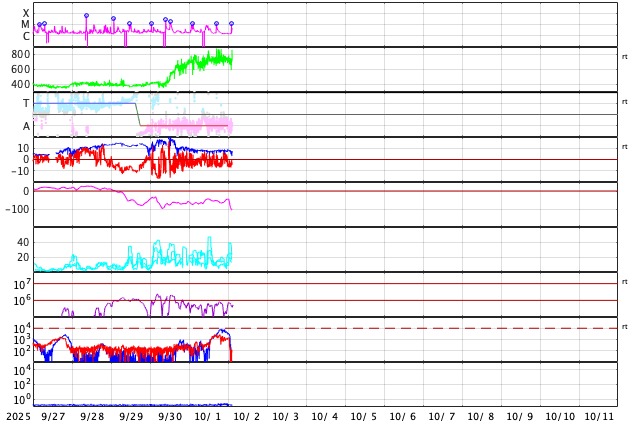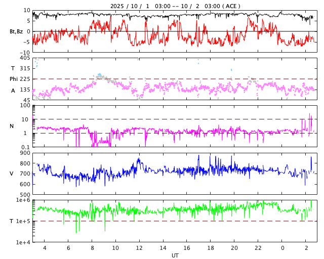 2025/10/ 2 11:57 更新 太陽風は700km/秒の高速の風が続いています。磁気圏も活動的です。 担当 篠原 太陽風は、かなり高速の状態が続いています。 グラフでは、700km/秒から750km/秒へ少し高まり、 その後、700km/秒に戻っています。 磁場強度は、7〜8nTと少し強まった状態が続いています。 磁場の南北成分は、南寄りの傾向が続いていて、 -5nT程度の変化が頻繁に発生しています。 磁気圏の活動は強まっていて、 AE指数は、1000〜1500nTの大きい変化が何度も発生しています。 GOES衛星SUVI 195では、 南半球でコロナホールが東西に長く伸びています。 現在の高速太陽風は、どこまで継続するでしょうか。 700km/秒と大きく高まっていることにも注目して下さい。 太陽は、中心部の4236黒点群で、C8.6の小規模フレア、 4232群で、M1.2の中規模フレアが発生しています。 この領域でCME(コロナ質量放出)が発生すると、 太陽風の乱れは地球へ向かってきます。 しばらく活動に注目して下さい。 また、南東の端(右下)の4226群でも M1.2の中規模フレアが発生しました。 ![]() GOES衛星SUVI 195カメラによる太陽コロナの様子 (c) GOES衛星SUVI 195 (NOAA) ![]() SDO衛星による太陽の可視光写真。SOHO衛星のWebページより取得しました。 (c) SDO (NASA) ![]() ACEが観測した太陽風の磁場(黒線は全体の強度、赤線は南北成分) 磁場の向き、プラズマの密度、速度、温度 (c) データ:NOAA/SWPC、作図:宇宙天気ニュース ![]() AE指数(速報値) 下段のAEグラフの値が高くなると、オーロラ活動が活発化しています。 (c) 京都大学WDC ![]() ![]() 27日の太陽周期に合わせた図 太陽が同じ面を地球に向けていた27日前の変化から、今後を予想することができます。 (c) 作図:宇宙天気ニュース