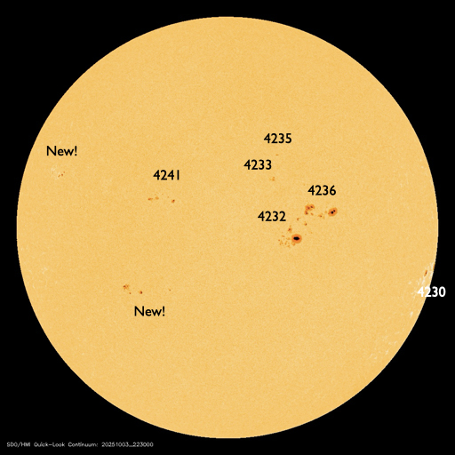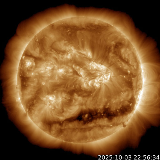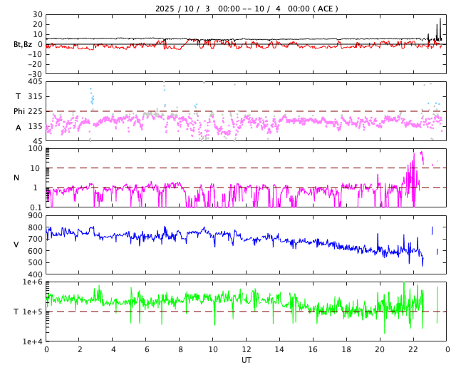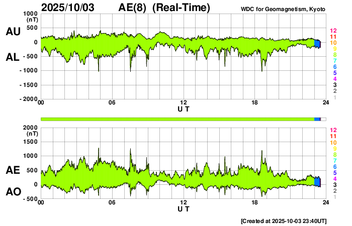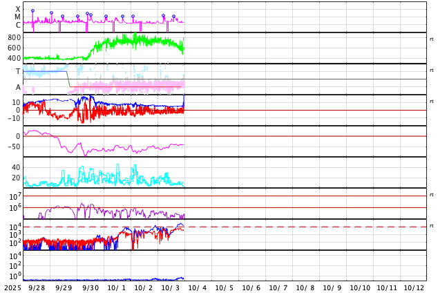 2025/10/ 4 08:57 更新 太陽風は高速ですが、600km/秒に下がっています。磁気圏は活動的な状態です。 担当 篠原 太陽風は、昨夜、3日20時(世界時3日11時)頃まで 750km/秒とかなり高まった状態が続きましたが、 その後ゆっくりと低下して、 現在は600km/秒前後と普通の高速風くらいになっています。 磁場強度は、5nTと平均的な値で推移しています。 磁場の南北成分は、-3nT程度の南向きが頻繁に発生しています。 磁気圏は活動的な状態が続いていて、 AE指数は500〜800nTと中規模の変化が連続的に発生しています。 速度が下がってきた影響か、 変化の大きさは次第に小さくなっています。 GOES衛星SUVI 195では、 南半球のコロナホールは、中心線を通り過ぎようとしています。 高速太陽風は、この後、次第に弱くなって行きそうです。 太陽は、中心部北西側(右上)の4236黒点群で、 M1.5の中規模フレアとC9.7の小規模フレアが 連続的に発生しています。 その後は特に活動はなく、落ち着いている印象です。 また、南西の端(右下)でもM1.2の中規模フレアが発生しています。