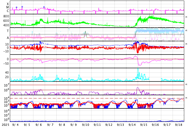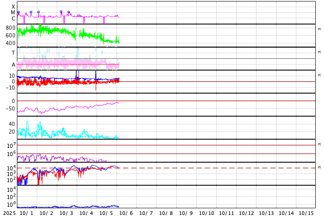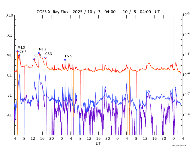 GOES衛星の太陽X線強度。赤・橙 = 0.1〜0.8 nm、青・紫 = 0.05〜0.4 nm (c) データ:NOAA/SWPC、作図:宇宙天気ニュース ![]() | |||||||||||||||||||||||||||||||||||||||||||||||||||||||||||||||||||||||||||||||||||||||||||||||||||||||||||||||||||||||||||||||||||||||||||||||||||||||||||||||||||||||||||||||||||||||||||||||||||||||||||||||||||||||||||||||||||||||||||||||||||||||||||||||||||||