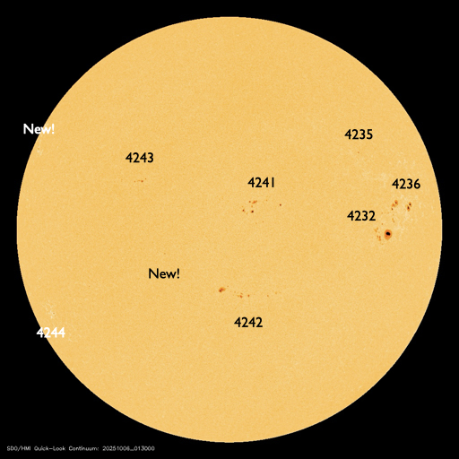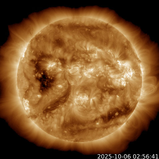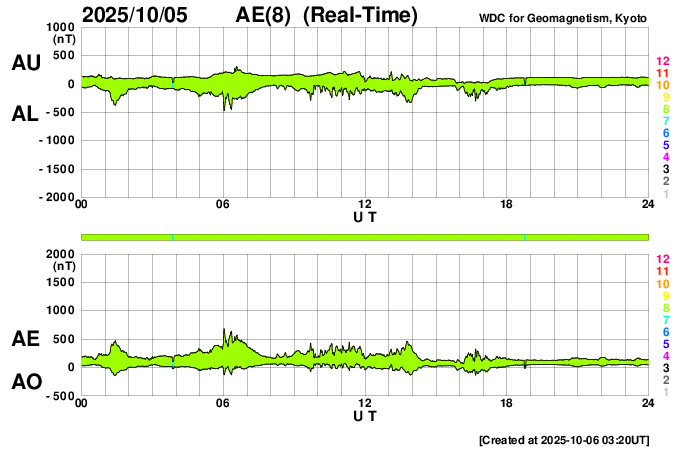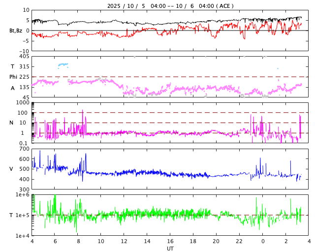 2025/10/ 6 12:38 更新 太陽風の速度は450km/秒に下がり、高速太陽風は終わっています。 担当 篠原 太陽風の速度は、昨日の夕方に500mkm/秒台を割り、 その後も次第に低下して、 現在は、450km/秒と平均的な速度に戻っています。 9月30日に始まった今回の高速太陽風は、 5日ほど続きました。 太陽風の磁場強度は、5nTから3nTに下がりましたが、 その後はゆっくりと上昇して、現在は7nTです。 磁場の南北成分は、前半は南寄りですが、 中ほどから北寄りに傾向が変わっています。 磁気圏の活動も穏やかになっていて、 AE指数は、初めの頃は小規模の変化が起きていますが、 後半は変化が見られなくなっています。 GOES衛星SUVI 195では、 東側(左側)の赤道域にコロナホールが見えています。 27日前と比べると、広がりが小さくなっています。 27日周期の図を見ると、 前周期は、9月15日から太陽風の速度が高まっています。 今回は、10月12日頃になりますが、 コロナホールの広がりを考えると、 速度の高まりは小さくなるかもしれません。 太陽は、C3〜4の小規模フレアが数回発生した程度で、 比較的穏やかな状態です。 ![]() GOES衛星SUVI 195カメラによる太陽コロナの様子 (c) GOES衛星SUVI 195 (NOAA) ![]() SDO衛星による太陽の可視光写真。SOHO衛星のWebページより取得しました。 (c) SDO (NASA) ![]() ACEが観測した太陽風の磁場(黒線は全体の強度、赤線は南北成分) 磁場の向き、プラズマの密度、速度、温度 (c) データ:NOAA/SWPC、作図:宇宙天気ニュース ![]() AE指数(速報値) 下段のAEグラフの値が高くなると、オーロラ活動が活発化しています。 (c) 京都大学WDC ![]() ![]() 27日の太陽周期に合わせた図 太陽が同じ面を地球に向けていた27日前の変化から、今後を予想することができます。 (c) 作図:宇宙天気ニュース