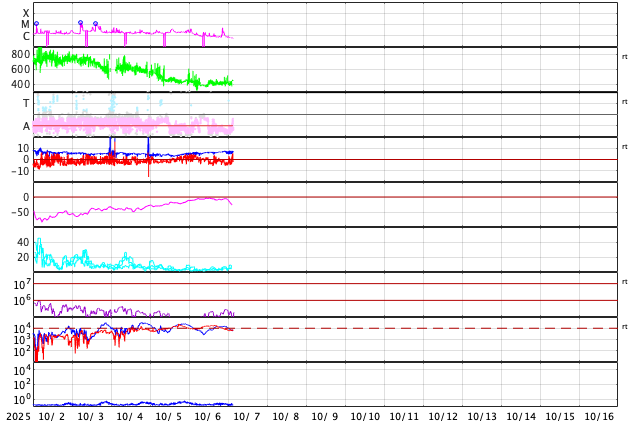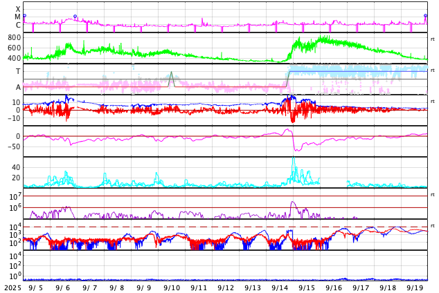 GOES衛星の太陽X線強度。赤・橙 = 0.1〜0.8 nm、青・紫 = 0.05〜0.4 nm (c) データ:NOAA/SWPC、作図:宇宙天気ニュース ![]() | ||||||||||||||||||||||||||||||||||||||||||||||||||||||||||||||||||||||||||||||||||||||||||||||||||||||||||||||||||||||||||||||||||||||||||||||||||||||||||||||||||||||||||||||||||||||||||||||||||||||||||||||||||||||||||||||||||||||||||||||||||||||||
