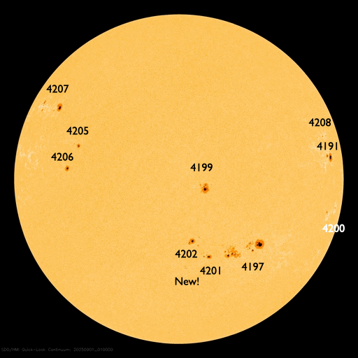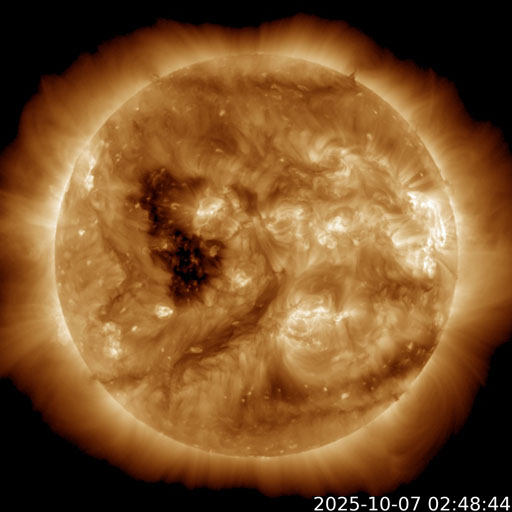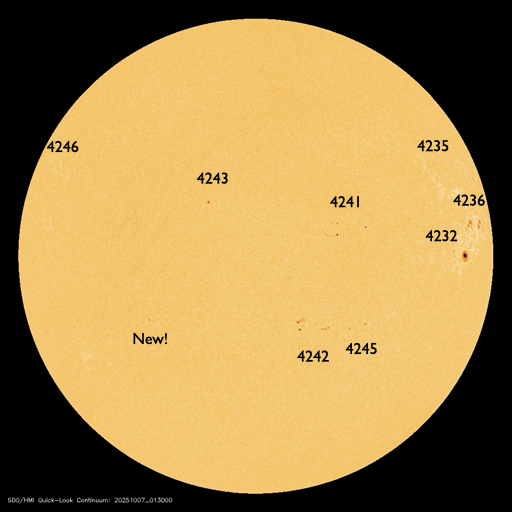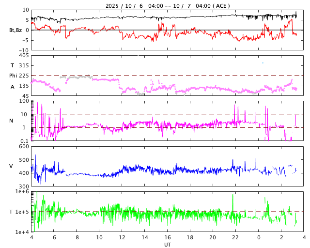 2025/10/ 7 12:38 更新 太陽風は平均的な状態です。9月の黒点相対数は 129.8 でした。 担当 篠原 WDC-SILSO より、9月の黒点相対数月平均値は、 129.8 と発表されました。 7月から、125.6、133.5、129.8と、 比較的安定した値が続いています。 1枚目の図を見ると、2024年後半の極大以降の、 ゆっくり下がる傾向に沿った値になっています。 1日値を見ると、9月の初めの頃と後半は150前後の日が続いていて、 その間の1週間程度、2桁に下がる日が発生しています。 2枚目の動画を見ると、途中に黒点が少なくなる期間があります。 最も少なかったのは、13日の54です。 太陽の東西の端に黒点群が見える程度で、 ちょっと寂しい太陽面になっていました。 太陽風は、420km/秒前後のの平均的な速さで安定しています。 磁場強度は、6nTから7nTに少し強まっています。 磁場の南北成分は、-3nT程度の南向きの変化がしばらく続いています。 磁気圏はやや活動的になって、 AE指数は300〜500nTの小規模の変化がしばらく続いています。 太陽風のグラフの最後では、磁場は北向きの変化が起きています。 この後は、南北どちら寄りで推移するでしょうか。 GOES衛星SUVI 195では、 コロナホールが太陽の中心線に近付いています。 4〜5日後くらいから、 この領域の影響で太陽風の速度が高まる可能性があります。 27日周期の図を見ると、 前周期は9月15日から太陽風の速度が高まっています。 この変化の回帰です。 太陽は、北西(右上)の領域でC5.1の小規模フレアが発生しています。 その他は目立った変化はなく、太陽は穏やかです。 ![]() 太陽黒点相対数の長期変化。9月の黒点相対数は 129.8 でした。 (c) 黒点データ:WDC-SILSO、作図:宇宙天気ニュース ![]() 9月の太陽黒点の推移。 (c) SDO衛星HMII (NASA)、(動画加工 : 宇宙天気ニュース) ![]() 1975年以降の太陽黒点相対数の長期変化。 (c) 黒点データ:WDC-SILSO、作図:宇宙天気ニュース ![]() GOES衛星SUVI 195カメラによる太陽コロナの様子 (c) GOES衛星SUVI 195 (NOAA) ![]() SDO衛星による太陽の可視光写真。SOHO衛星のWebページより取得しました。 (c) SDO (NASA) ![]() ACEが観測した太陽風の磁場(黒線は全体の強度、赤線は南北成分) 磁場の向き、プラズマの密度、速度、温度 (c) データ:NOAA/SWPC、作図:宇宙天気ニュース ![]() AE指数(速報値) 下段のAEグラフの値が高くなると、オーロラ活動が活発化しています。 (c) 京都大学WDC ![]() ![]() 27日の太陽周期に合わせた図 太陽が同じ面を地球に向けていた27日前の変化から、今後を予想することができます。 (c) 作図:宇宙天気ニュース