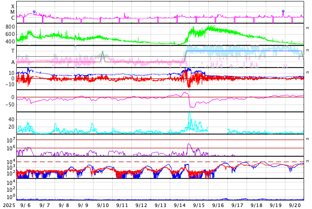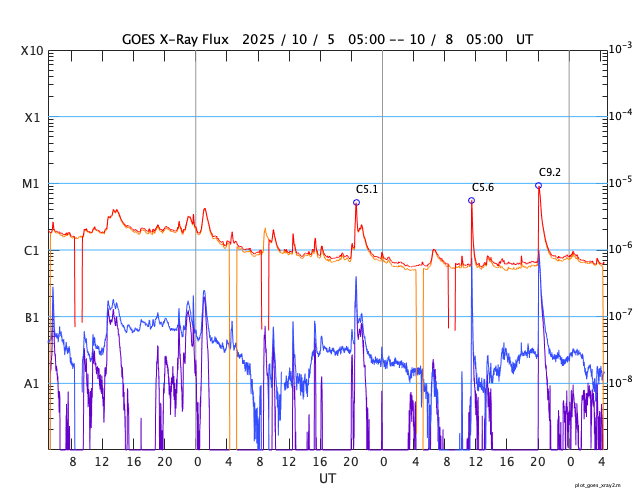GOES衛星の太陽X線強度。赤・橙 = 0.1〜0.8 nm、青・紫 = 0.05〜0.4 nm (c) データ:NOAA/SWPC、作図:宇宙天気ニュース ![]() | ||||||||||||||||||||||||||||||||||||||||||||||||||||||||||||||||||||||||||||||||||||||||||||||||||||||||||||||||||||||||||||||||||||||||||||||||||||||||||||||||||||||||||||||||||||||||||||||||||||||||||||||||||||||||||||||||||||||||||||